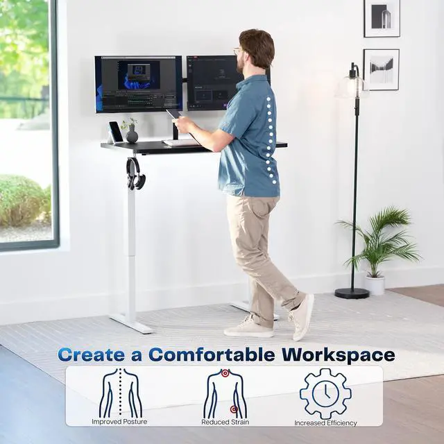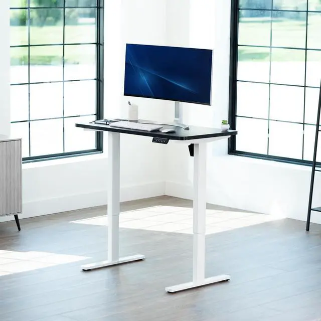 Transform your workstation to accommodate an active work life with the Black / White 43 x 24 Electric Desk (DESK-KIT-1W4B) from VIVO! Finding a healthy balance between sitting and standing throughout the long work day is made possible with electric height adjustment, telescopic legs, and a simple push button controller featuring 4 memory presets. The space-efficient table top provides room for dual monitor setups and important supplies so you can organize your workspace to fit your preferred layout. With a frame constructed of solid steel, this desk supports up to 220 lbs and is built to last. Cable management clips keep cords and cables neatly organized and hidden from view for a tidy workspace that encourages concentration. All hardware and instructions are provided, so you can get your new workstation assembled and experience your very own standing desk in no time!