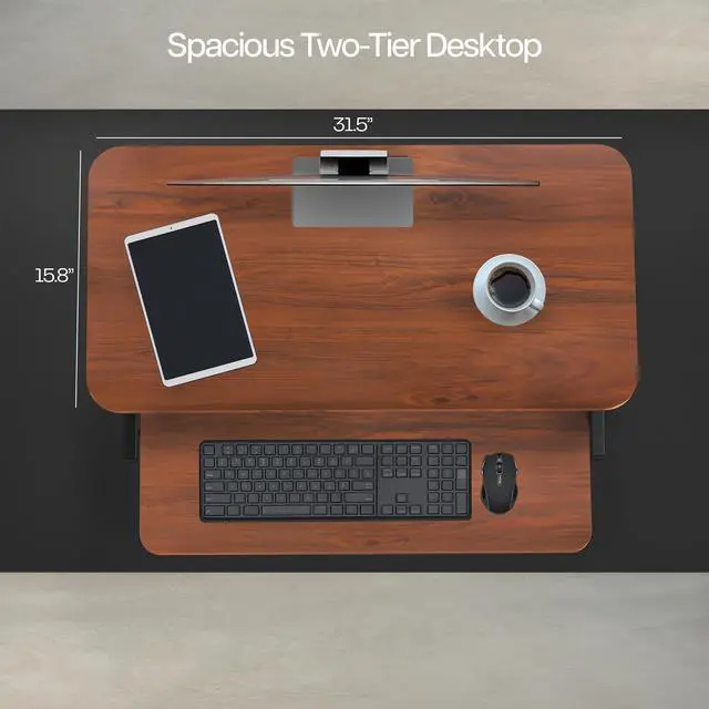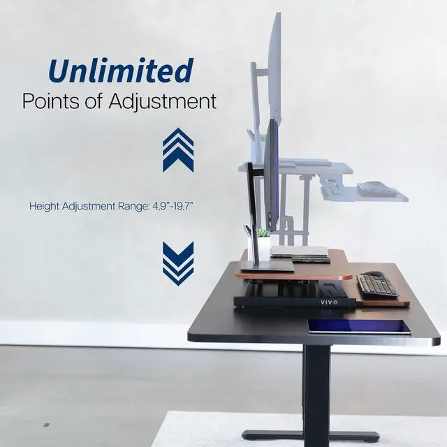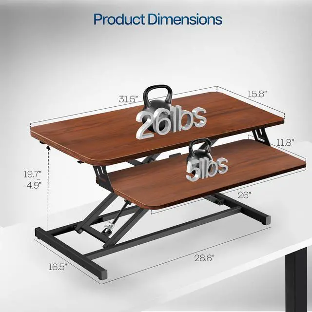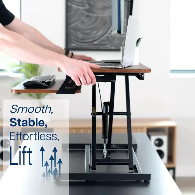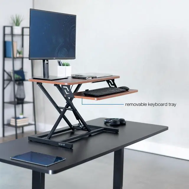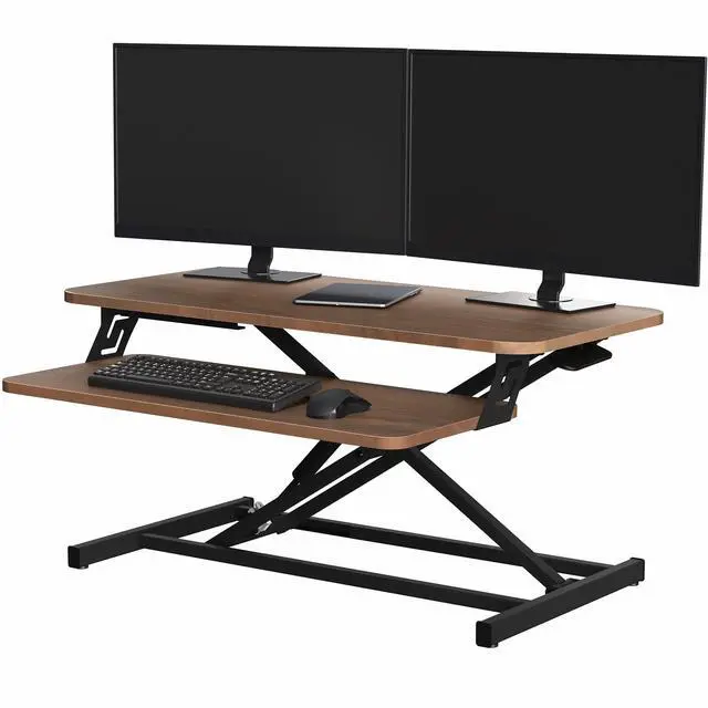 Enhance your work experience with a Dark Walnut / Black Desk Riser (DESK-V000SD) from VIVO! Transitioning between sitting and standing throughout the long work day provides numerous health benefits for the body such as increased blood flow and reduced aches and pains. This solidly built desktop supports up to 26 lbs, easily holding multiple monitors or laptop and monitor combinations. It also features pneumatic spring lift that allows simple and smooth height adjustment at the squeeze of a handle. The dual tiered design allows you to customize your work area to create the workflow you need, and the keyboard tray is removable using the provided hex tool. All necessary hardware and instructions are provided so you can get your new desk riser assembled and workspace organized in no time!