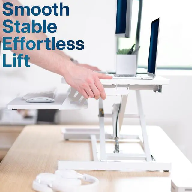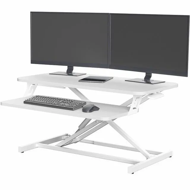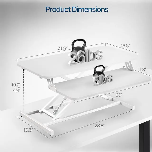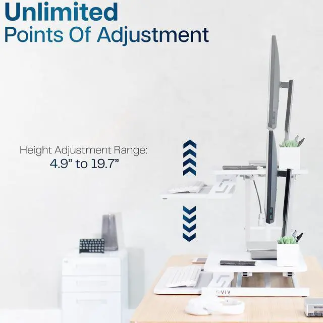 Enhance your work experience with the White Desk Riser (DESK-V000SW) from VIVO! Transitioning between sitting and standing throughout the long work day provides numerous health benefits for the body such as increased blood flow and reduced aches and pains. This solidly built desktop supports up to 26 lbs, easily holding multiple monitors or laptop and monitor combinations. It also features pneumatic spring lift that allows simple and smooth height adjustment (4.9 to 19.7) at the squeeze of a handle. The dual-tiered design allows you to customize your work area to create the workflow you need, and the keyboard tray is removable using the provided hex tool. All necessary hardware and instructions are provided so you can get your new desk riser assembled and workspace organized in no time!
