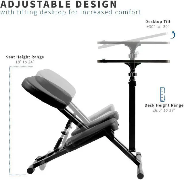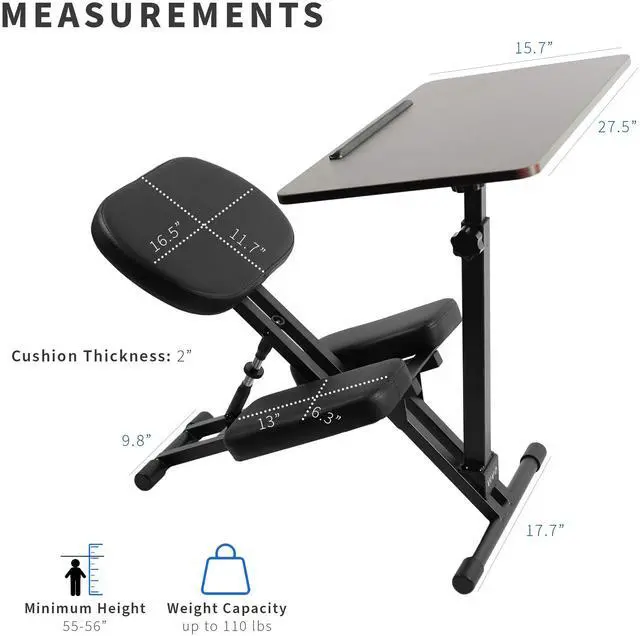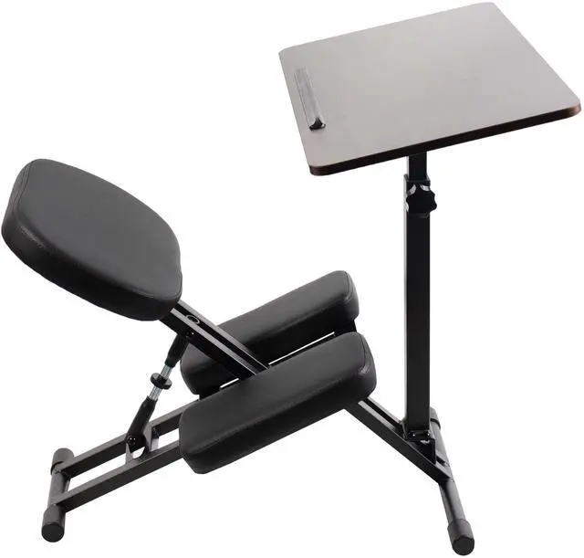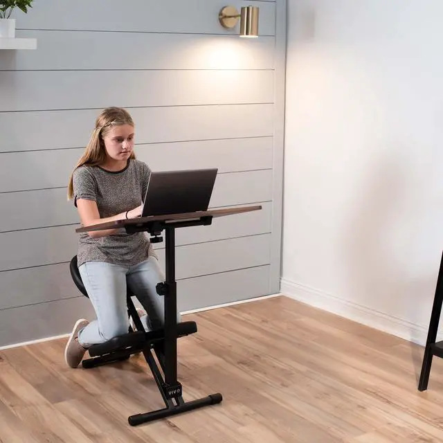 Improve posture at a young age with the Black / Dark Wood Kids' Kneeling Chair and Desk (DESK-KN02D) from VIVO! Sitting in a regular chair for long hours takes its toll, and combined with poor posture results in muscle pain and tension. But that doesnt have to be the case for your young student! Our keeling chairs are designed to take pressure away from the spine and distribute it among the buttocks and legs, relieving back tension and strengthening the core. This sturdy chair and desk provide posture benefits of standing and the relief of sitting, creating a whole new element to home study. Since this stool requires different muscles than a regular chair, its best to use it in increments while working on studies, reading a favorite book, or completing a writing assignment. Featuring a height adjustable desktop and seat with thick fabric cushions, this kneeling chair and desktop will be your aspiring students new bestie!