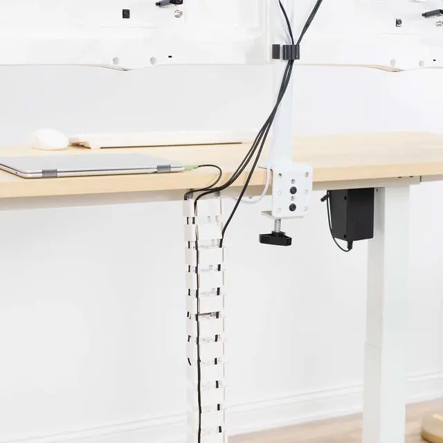 Tame messy cables at your workstation with the White Vertebrae Cable Management Kit for Desk (DESK-AC01C-W) from VIVO! This flexible strip provides modern and attractive desk to floor cable management for your work area. The square interlocking clips are built with ergonomics and versatility in mind, featuring a quad entry cabling system for efficient cord organization. Keep unsightly and hazardous A/V and power cords clean and protected with this convenient addition to your work environment.