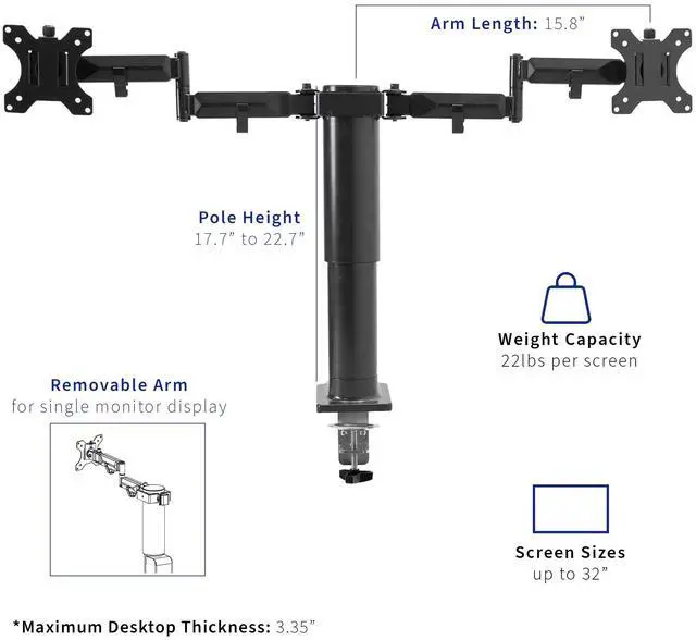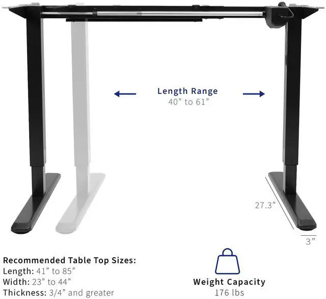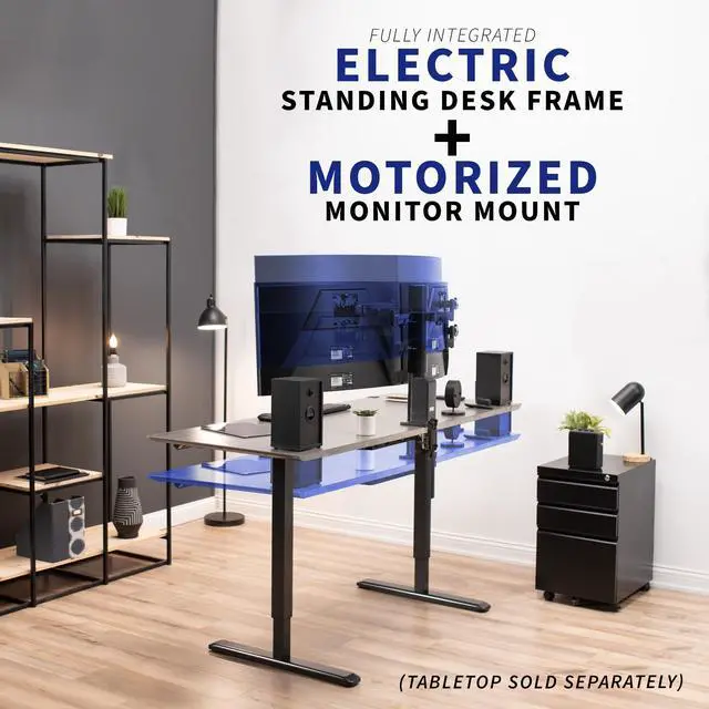 Take ergonomics to a new level with the first-on-the-market Black Single Motor Desk Frame with Electric Dual Monitor Arm (STAND-E-102B) from VIVO! The sleek touch panel controller allows for independent height adjustments of the electric desk frame and motorized dual monitor mount, making it easy to find the perfect ergonomic height for both viewing and typing. Heights are individually set when customizing memory function, then simultaneously engaged when the memory key is selected. The monitor mount also includes a single monitor converter collar if your setup only has one monitor. Solid steel construction keeps your desk frame and monitor stand stable for long-lasting use. Please note this product requires a separate purchase of a compatible table top.