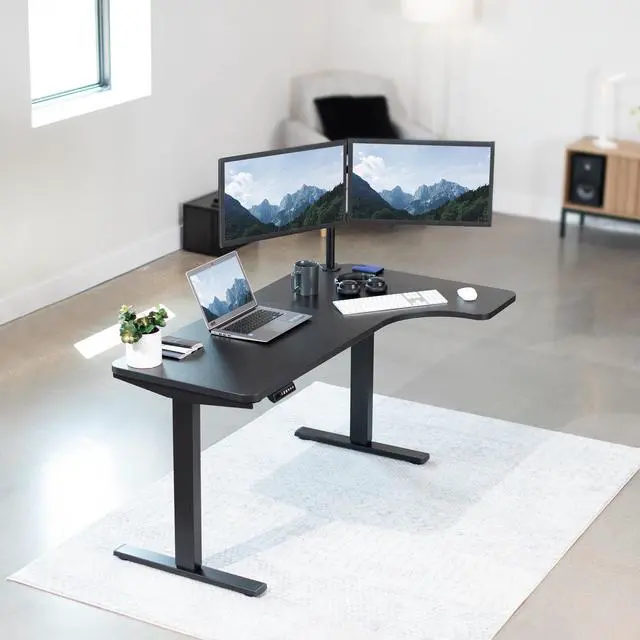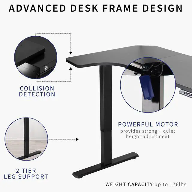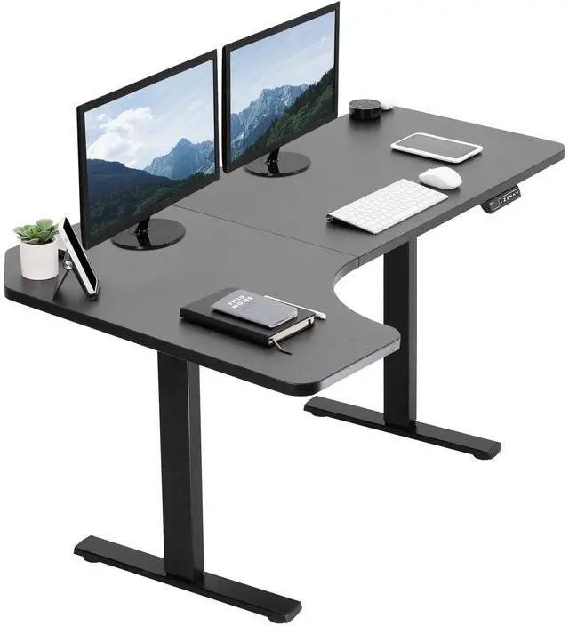 Transform your workstation to accommodate an active work life with the Black 58" x 35" Corner Electric Desk from VIVO! Finding a healthy balance between sitting and standing throughout the long work day is made possible with electric height adjustment, telescopic legs, and a simple push-button controller featuring 4 memory presets. The spacious corner table top provides room for dual monitor setups and important supplies so you can organize your workspace to fit your preferred layout. With a frame constructed of solid steel, this desk supports up to 220 lbs and is built to last. Cable management clips keep cords and cables neatly organized and hidden from view for a tidy workspace that encourages concentration. All hardware and instructions are provided, so you can get your new workstation assembled and experience your very own standing desk in no time!
