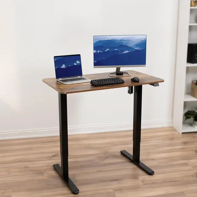 Transform your workstation to accommodate an active work life with Vintage Brown / Black 40" x 24" Electric Desk (DESK-EP40TN) from VIVO! Finding a healthy balance between sitting and standing throughout the long work day is made possible with electric height adjustment, telescopic legs, and a simple 2-button controller. This desk also features overload and heat protection with adjustable feet that adapt to most floor surfaces. The space-efficient 2-part table top provides room for dual monitor setups and important supplies so you can organize your workspace to fit your preferred layout. All hardware and instructions are provided, so you can get your new workstation assembled and taking you to new heights!