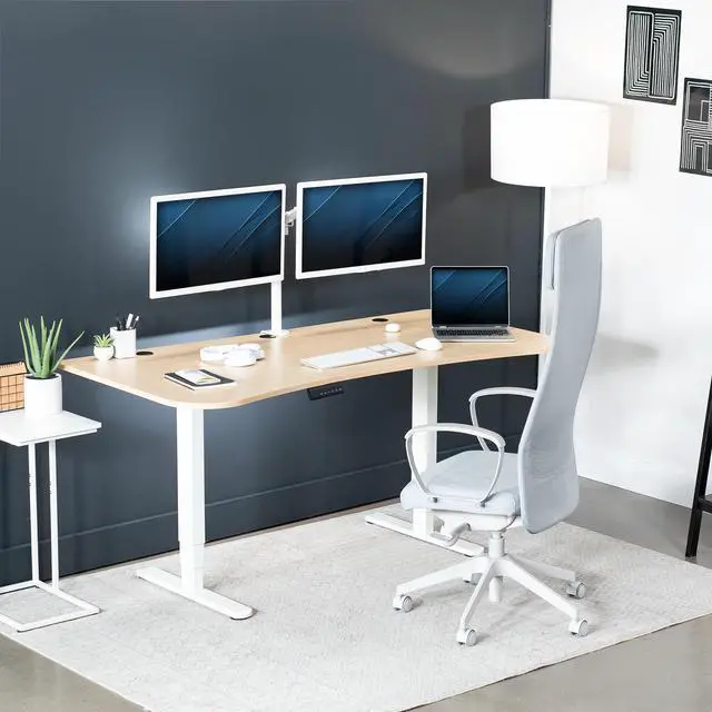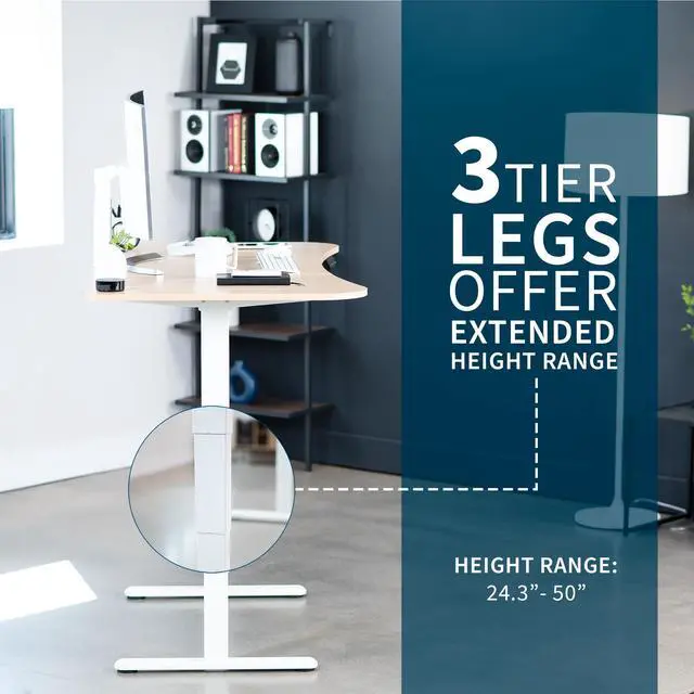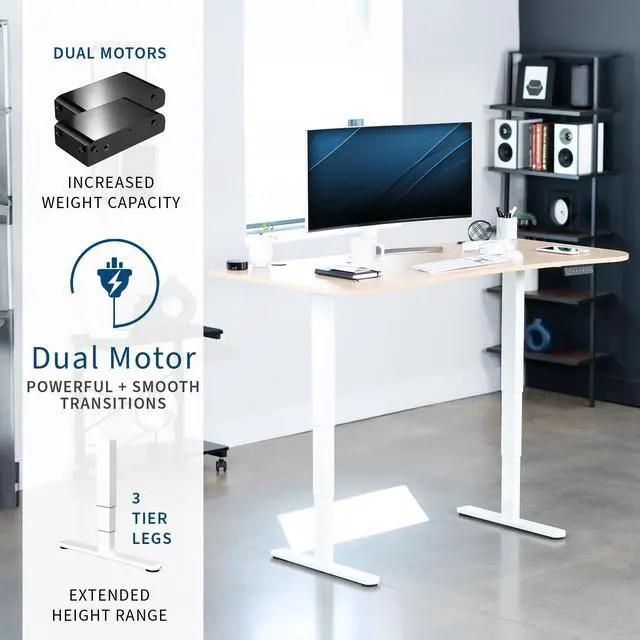 Transform your workstation to accommodate an active work life with the Light Wood / White 63" x 32" Electric Desk (DESK-KIT-2W1C) from VIVO! Find that healthy balance between sitting and standing throughout the long work day with smooth height adjustment, powerful dual motors, and a simple push-button controller featuring 3 memory presets. With a frame constructed of solid steel, this desk supports up to 220 lbs when connected to a power source. The table top comes packaged in 3 sections, and all hardware is provided to get your desk frame put together and installed to your desktop in no time!