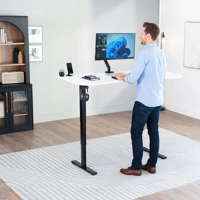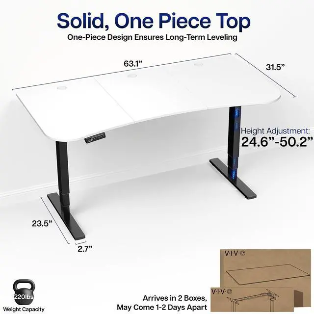Transform your workstation to accommodate an active work life with the White / Black 63" x 32" Electric Desk (DESK-KIT-2EBW) from VIVO! Find that healthy balance between sitting and standing throughout the long work day with electric adjustment, 3-stage telescopic legs for extra height, and an elegant touch-screen controller featuring memory presets. With a frame constructed of solid steel, this desk supports up to 220 lbs and is built to last. The table top has a curved, modern shape with cable management openings and comes packaged in 3 sections. All hardware is provided to get the desk frame put together and installed to the desktop in no time!
