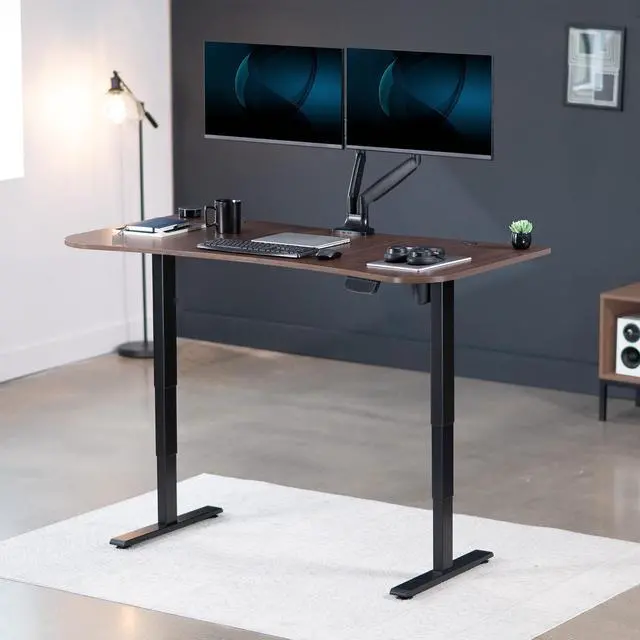 Transform your workstation to accommodate an active work life with the Dark Walnut / Black 63" x 32" Electric Desk (DESK-KIT-2EBD) from VIVO! Find that healthy balance between sitting and standing throughout the long work day with electric adjustment, 3-stage telescopic legs for extra height, and an elegant touch-screen controller featuring memory presets and a timer reminder. With a frame constructed of solid steel, this desk supports up to 176 lbs and is built to last. The table top has a curved, modern shape with cable management openings and comes packaged in 3 sections. All hardware is provided to get the desk frame put together and installed to the desktop in no time!