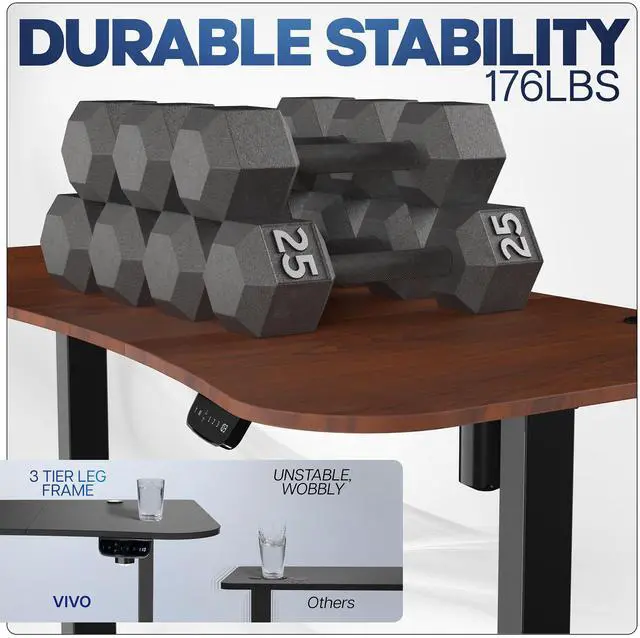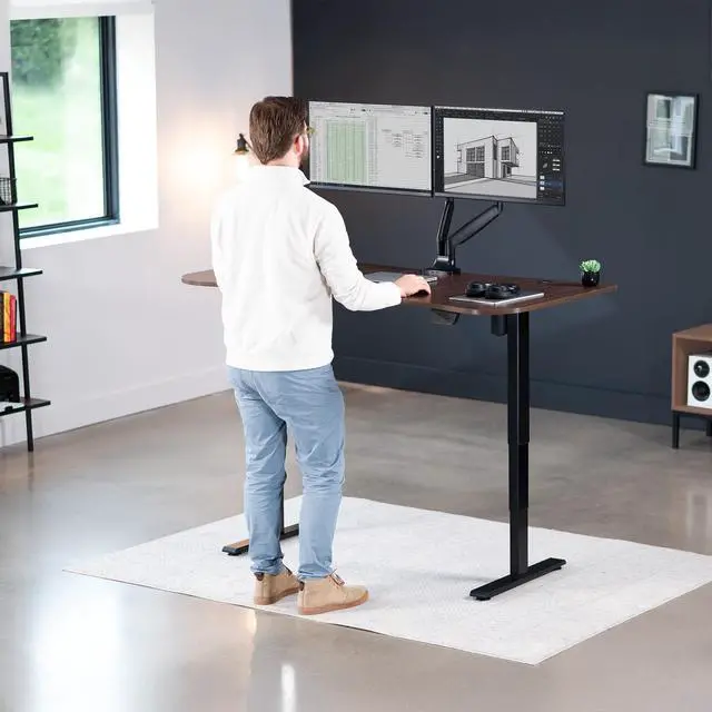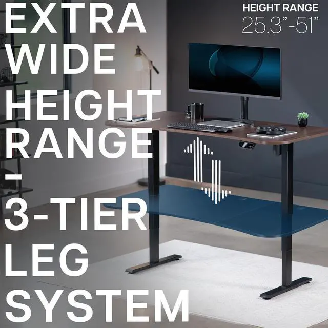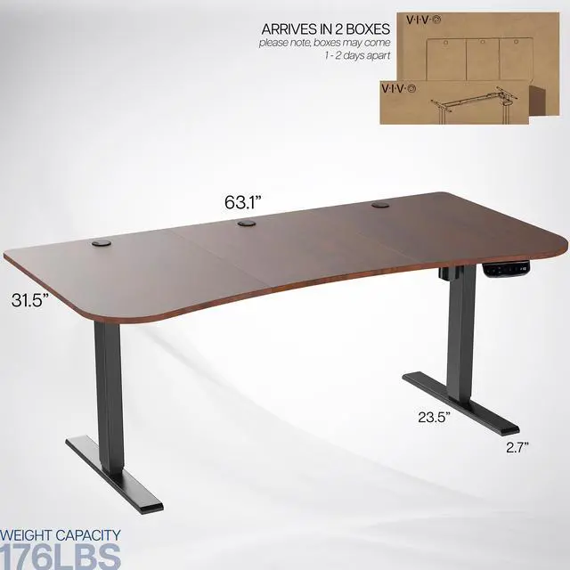 Transform your workstation to accommodate an active work life with the Dark Walnut / Black 63" x 32" Electric Desk (DESK-KIT-2EBD) from VIVO! Find that healthy balance between sitting and standing throughout the long work day with electric adjustment, 3-stage telescopic legs for extra height, and an elegant touch-screen controller featuring memory presets. With a frame constructed of solid steel, this desk supports up to 220 lbs and is built to last. The table top has a curved, modern shape with cable management openings and comes packaged in 3 sections. All hardware is provided to get the desk frame put together and installed to the desktop in no time!