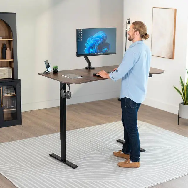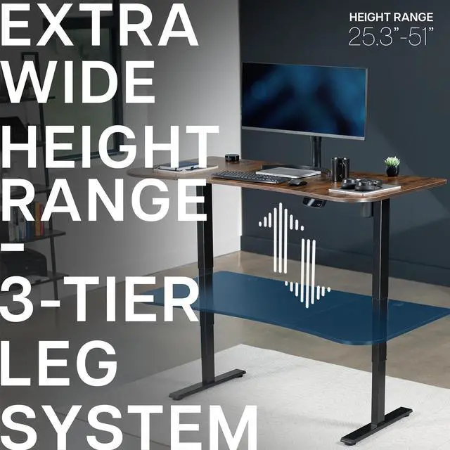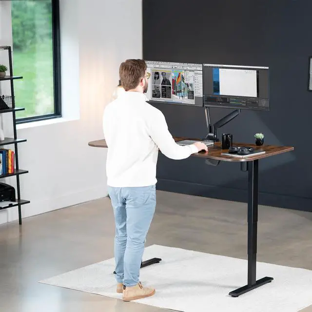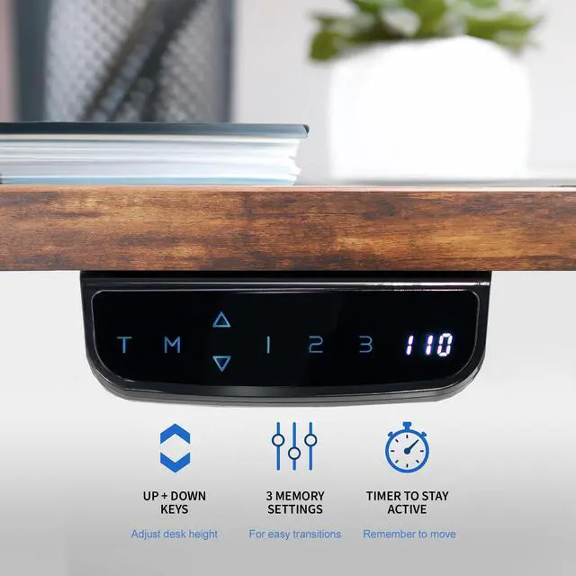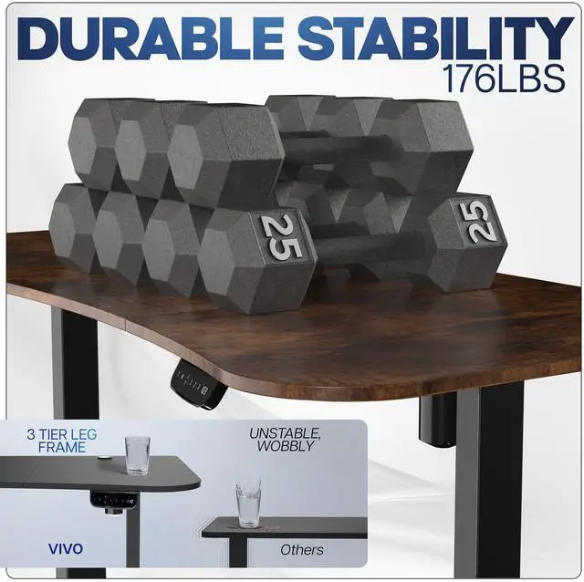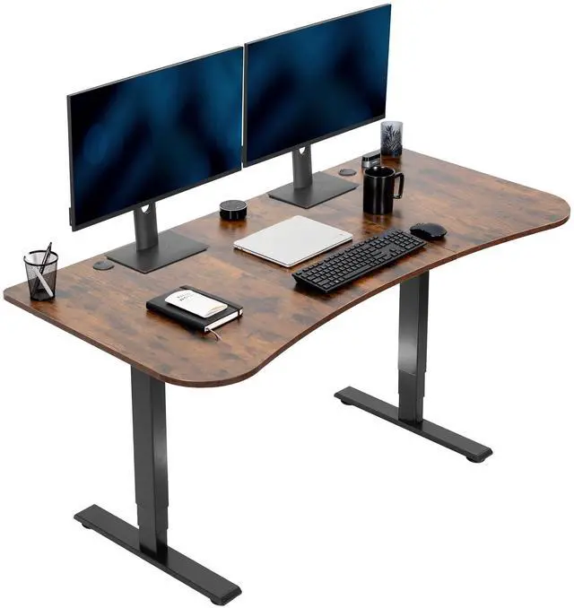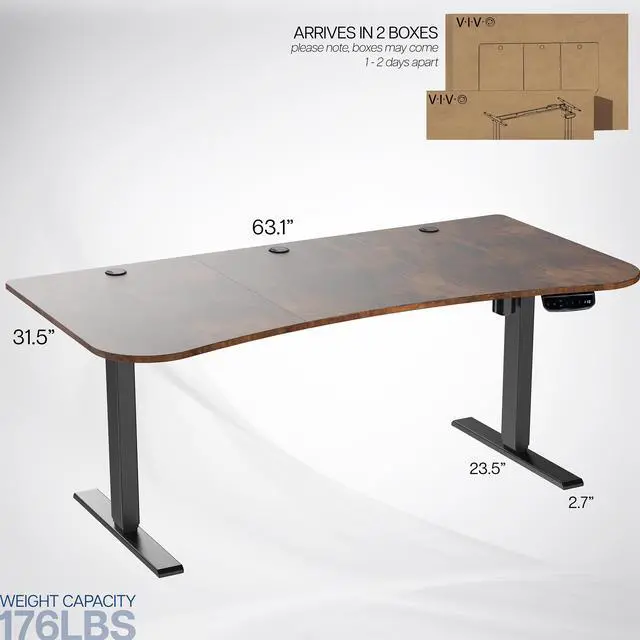Transform your workstation to accommodate an active work life with the Vintage Brown / Black 63" x 32" Electric Desk (DESK-KIT-2EBN) from VIVO! Find that healthy balance between sitting and standing throughout the long work day with electric adjustment, 3-stage telescopic legs for extra height, and an elegant touch-screen controller featuring memory presets. With a frame constructed of solid steel, this desk supports up to 220 lbs and is built to last. The table top has a curved, modern shape with cable management openings and comes packaged in 3 sections. All hardware is provided to get the desk frame put together and installed to the desktop in no time!