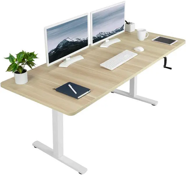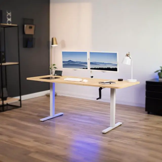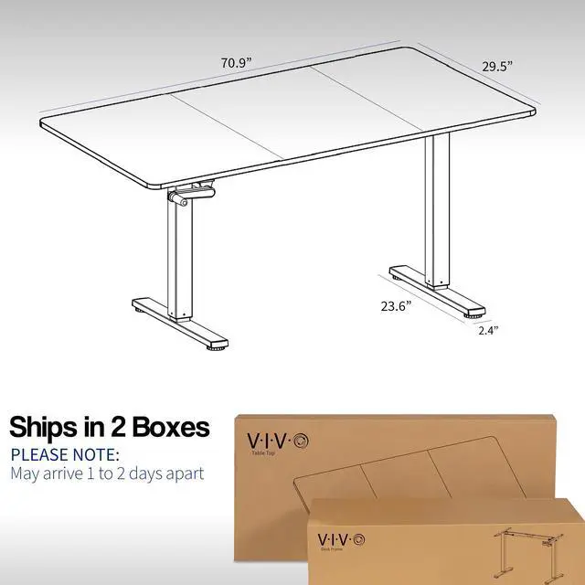 Transform your workstation to accommodate an active work life with the Light Wood / White 71" x 30" Manual Height Adjustable Desk (DESK-KIT-MW7C) from VIVO! Finding a healthy balance between sitting and standing throughout the long work day is made possible with manual height adjustment, telescopic legs, and an easy-to-use hand crank. The sturdy table top provides room for dual monitor setups and important supplies so you can organize your workspace to fit your preferred layout. With a frame constructed of solid steel, this desk easily supports up to 154 lbs and is built to last. All hardware and instructions are provided, so you can get your new workstation assembled and taking your processes to new heights! PLEASE NOTE: This product ships in 2 separate boxes that may not arrive at the same time, and each package contains a helpful instruction guide.