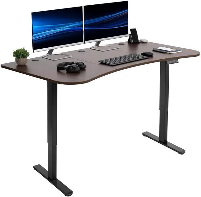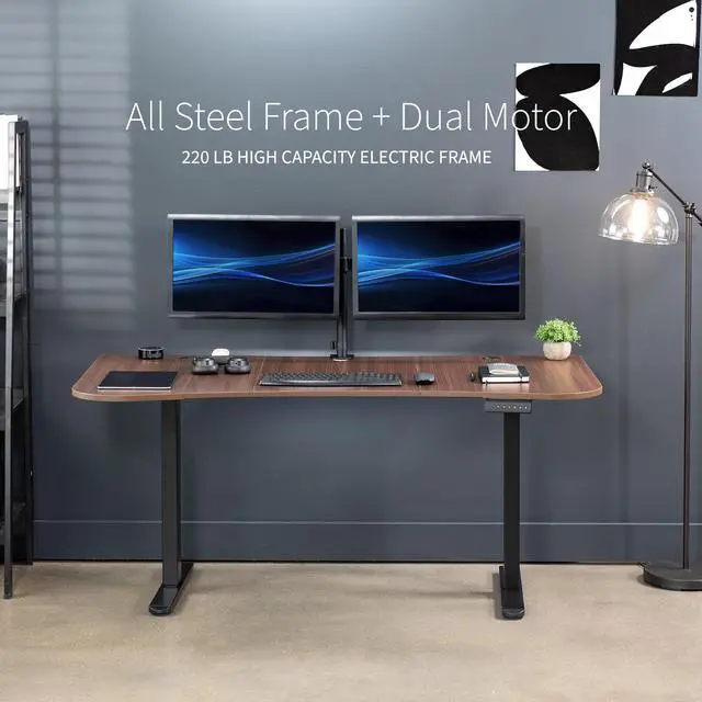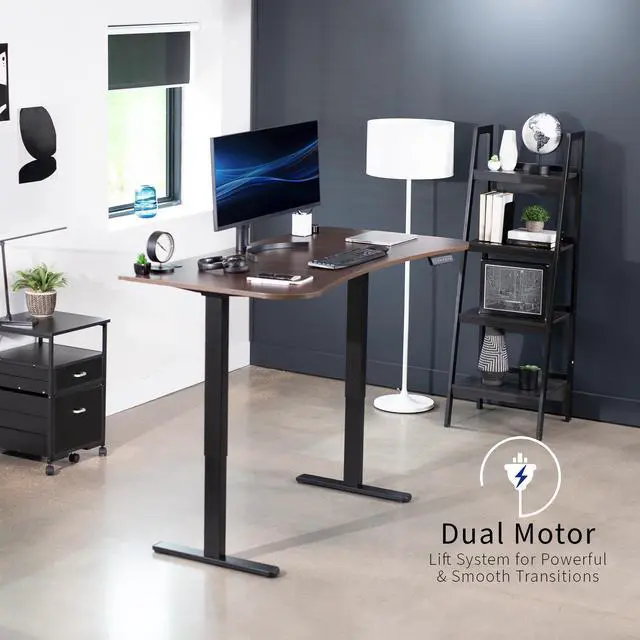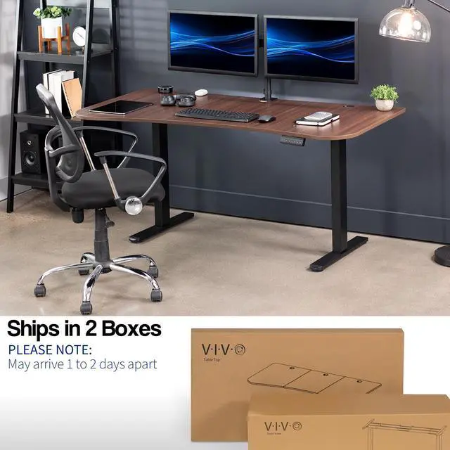 Transform your workstation to accommodate an active work life with the Dark Walnut / Black 63" x 32" Dual Motor Electric Desk (DESK-KIT-E2B1D) from VIVO! Find that healthy balance between sitting and standing throughout the long work day with electric height adjustment, telescopic legs, and a simple push-button controller featuring 3 memory presets. With a frame constructed of solid steel, this desk supports up to 220 lbs and is built to last. The table top comes packaged in 3 sections, and all hardware is provided to get your desk frame put together and installed to your desktop in no time! Please Note: This product ships in 2 separate boxes that may not arrive at the same time, and each package contains a helpful instruction guide.