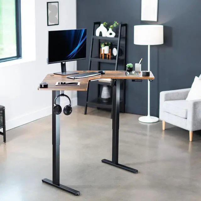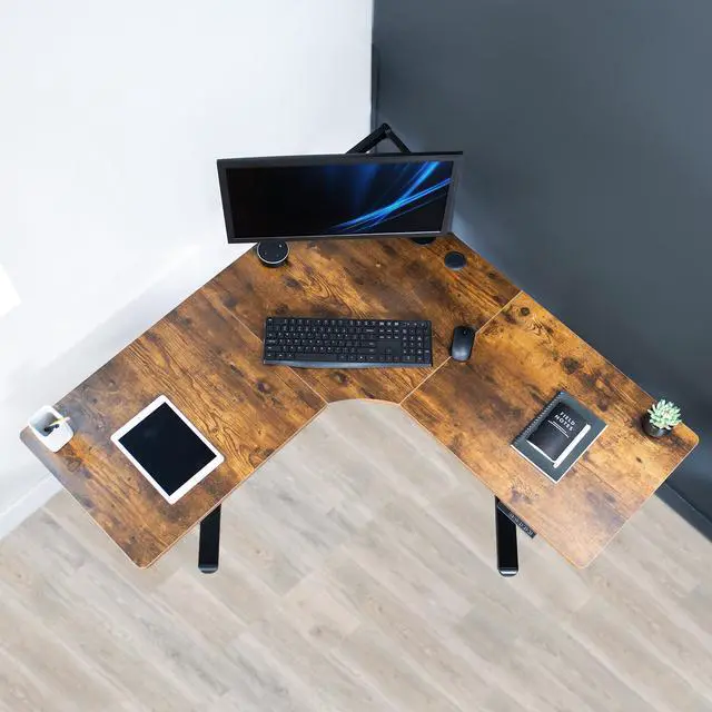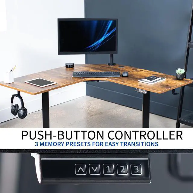 Enjoy a spacious workstation that accommodates an active work life with the Vintage Brown / Black Corner Electric Desk (DESK-E1L94N) from VIVO! Periodically standing throughout the long work day helps relieve tension on the neck, back, and shoulders while increasing blood flow and reducing stress. Enjoy being able to stand up in seconds with this corner workstation featuring a powerful motor lift system for smooth height transitions, a simple push button controller with 3 memory presets, and solid legs supporting up to 154 lbs. The cable management system ensures that cords and cables are neatly organized for a tidy workspace that encourages concentration. All hardware and instructions are provided for assembly, so you can experience your own active desk in no time!