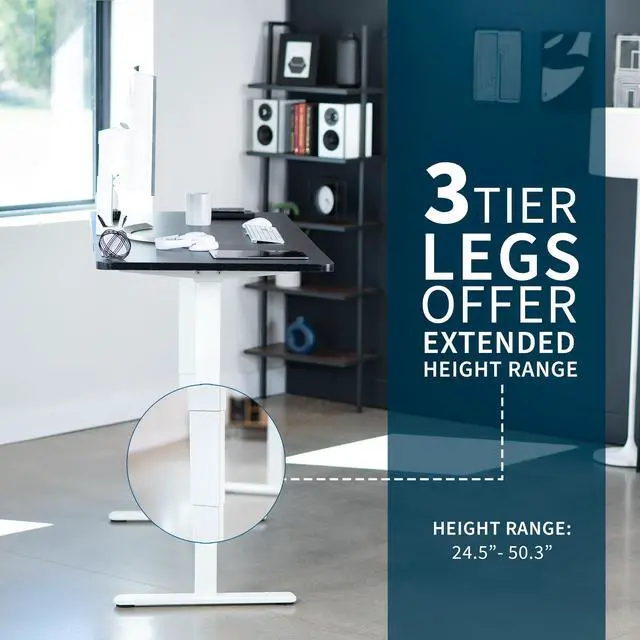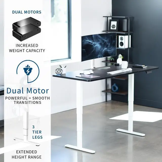 Transform your workstation to accommodate an active work life with the Black / White 71" x 30" Electric Desk (DESK-KIT-2W7B) from VIVO! Finding a healthy balance between sitting and standing throughout the long work day is made possible with electric height adjustment, telescopic legs, and a simple push-button controller featuring 3 memory presets. The spacious table top provides room for dual monitor setups and important supplies so you can organize your workspace to fit your preferred layout. With a frame constructed of solid steel, this desk supports up to 220 lbs and is built to last. All hardware and instructions are provided, so you can get your new workstation assembled and taking you to new heights!