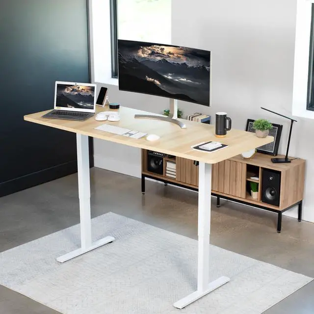 Transform your workstation to accommodate an active work life with the Light Wood / White 71" x 30" Electric Desk (DESK-KIT-1W7C) from VIVO! Finding a healthy balance between sitting and standing throughout the long work day is made possible with electric height adjustment, telescopic legs, and a memory control panel. The spacious table top provides room for dual monitor setups and important supplies so you can organize your workspace to fit your preferred layout. With a frame constructed of solid steel, this desk supports up to 176 lbs and is built to last. All hardware and instructions are provided, so you can get your new workstation assembled and taking you to new heights!