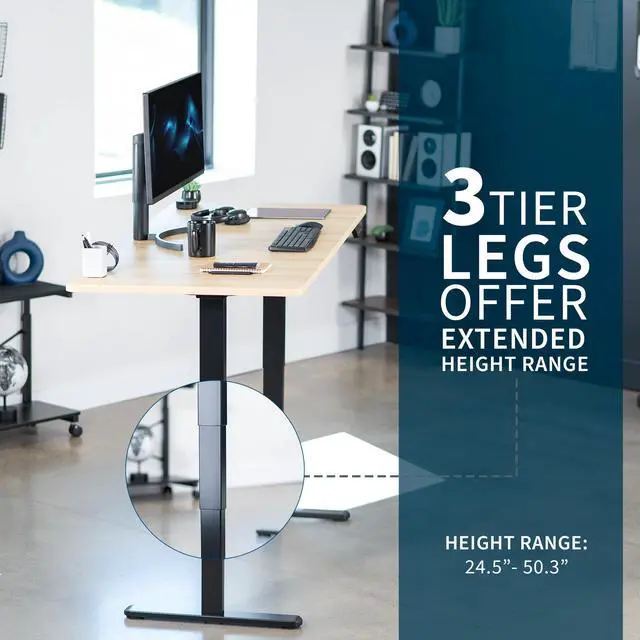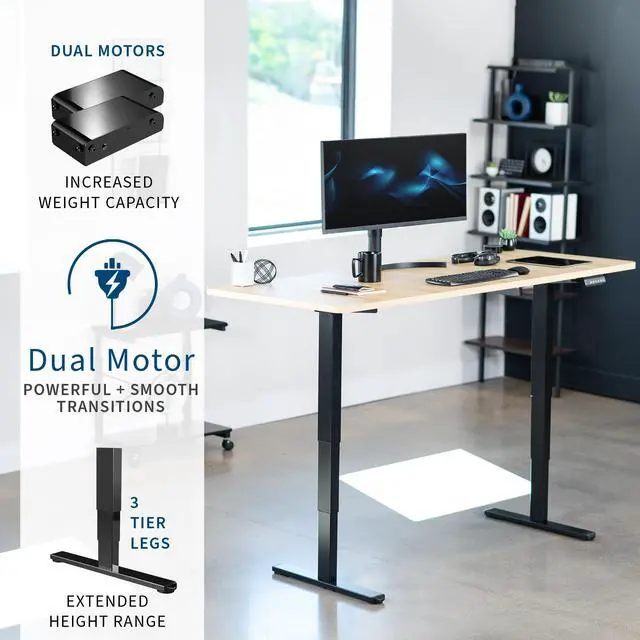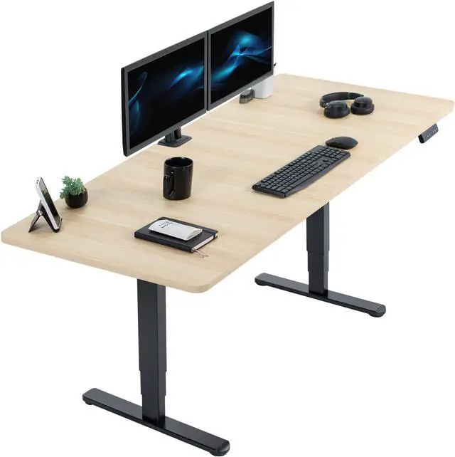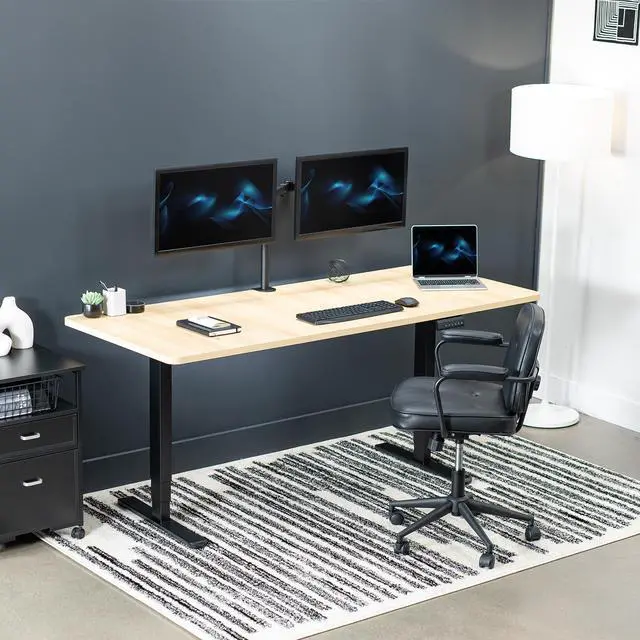 Transform your workstation to accommodate an active work life with the Light Wood / Black 71" x 30" Electric Desk (DESK-KIT-2B7C) from VIVO! Finding a healthy balance between sitting and standing throughout the long work day is made possible with electric height adjustment, telescopic legs, and a simple push-button controller featuring 3 memory presets. The spacious table top provides room for dual monitor setups and important supplies so you can organize your workspace to fit your preferred layout. With a frame constructed of solid steel, this desk supports up to 220 lbs and is built to last. All hardware and instructions are provided, so you can get your new workstation assembled and taking you to new heights!