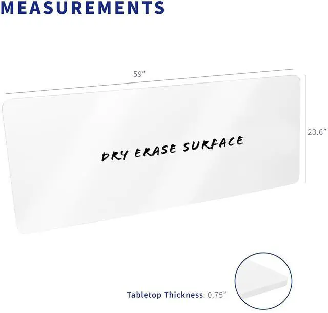 Create an interactive note-taking workspace with the White 60" x 24" Dry Erase Table Top (DESK-TOP6WE) from VIVO! This spacious 59 whiteboard desktop provides a sleek writing surface across the entire top, giving you plenty of space to sketch out ideas or take notes. The solid, one-piece design is free of seam breaks, providing a clean surface for collaborative work. Clean-erase design means youre always ready to tackle the next project, reducing your need for sticky notes and paper tablets. Compatible with both manual and electric frames measuring 39 to 58 in length, this table top gives you options! Whether you're creating your very first sit-to-stand workstation or you need a replacement part, this desk surface was built to last! Simple instructions and hardware are provided to get your new platform attached to your current desk frame in no time!