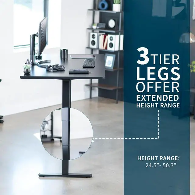 Transform your workstation to accommodate an active work life with the Black 71 x 36 Electric Desk (DESK-KIT-2B7B-36) from VIVO! Finding a healthy balance between sitting and standing throughout the long work day is made possible with electric height adjustment, telescopic legs, and a simple push button controller featuring 3 memory presets. The spacious table top provides room for dual monitor setups and important supplies so you can organize your workspace to fit your preferred layout. With a frame constructed of solid steel, this desk supports up to 220 lbs and is built to last. All hardware and instructions are provided, so you can get your new workstation assembled and taking you to new heights!