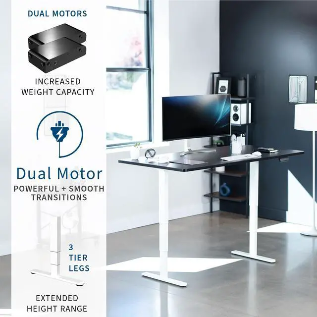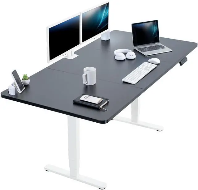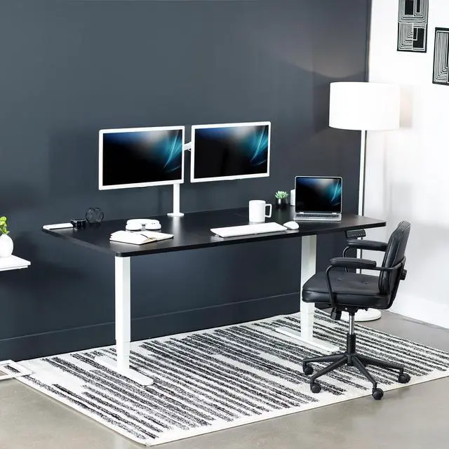 Transform your workstation to accommodate an active work life with the Black / White 71 x 36 Electric Desk (DESK-KIT-2W7B-36) from VIVO! Finding a healthy balance between sitting and standing throughout the long work day is made possible with electric height adjustment, telescopic legs, and a simple push button controller featuring 3 memory presets. The spacious table top provides room for dual monitor setups and important supplies so you can organize your workspace to fit your preferred layout. With a frame constructed of solid steel, this desk supports up to 220 lbs and is built to last. All hardware and instructions are provided, so you can get your new workstation assembled and taking you to new heights!