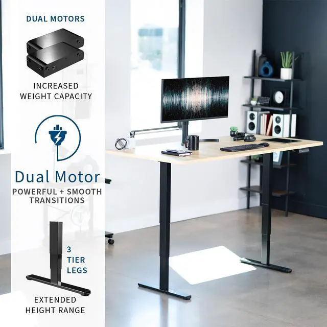 Transform your workstation to accommodate an active work life with the Light Wood / Black 71 x 36 Electric Desk (DESK-KIT-2B7C-36) from VIVO! Finding a healthy balance between sitting and standing throughout the long work day is made possible with electric height adjustment, telescopic legs, and a simple push button controller featuring 3 memory presets. The spacious table top provides room for dual monitor setups and important supplies so you can organize your workspace to fit your preferred layout. With a frame constructed of solid steel, this desk supports up to 220 lbs and is built to last. All hardware and instructions are provided, so you can get your new workstation assembled and taking you to new heights!