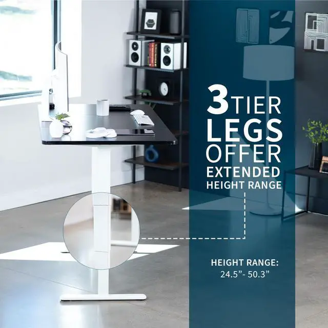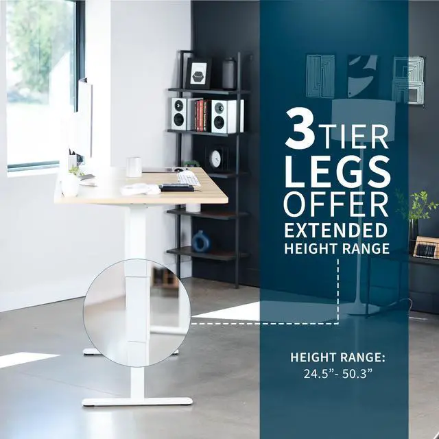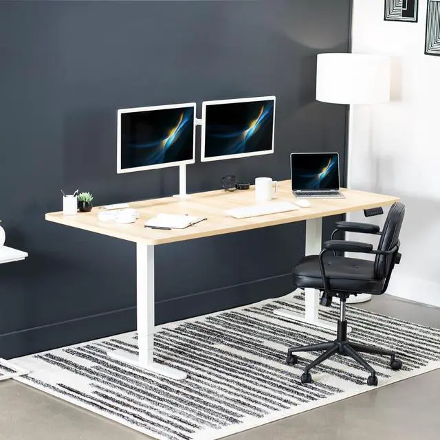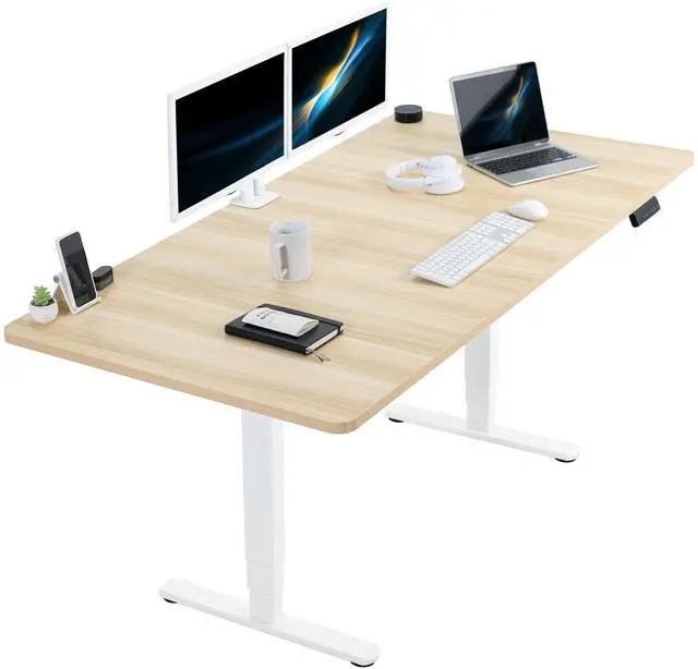 Transform your workstation to accommodate an active work life with the Light Wood / White 71 x 36 Electric Desk (DESK-KIT-2W7C-36) from VIVO! Finding a healthy balance between sitting and standing throughout the long work day is made possible with electric height adjustment, telescopic legs, and a simple push button controller featuring 3 memory presets. The spacious table top provides room for dual monitor setups and important supplies so you can organize your workspace to fit your preferred layout. With a frame constructed of solid steel, this desk supports up to 220 lbs and is built to last. All hardware and instructions are provided, so you can get your new workstation assembled and taking you to new heights!