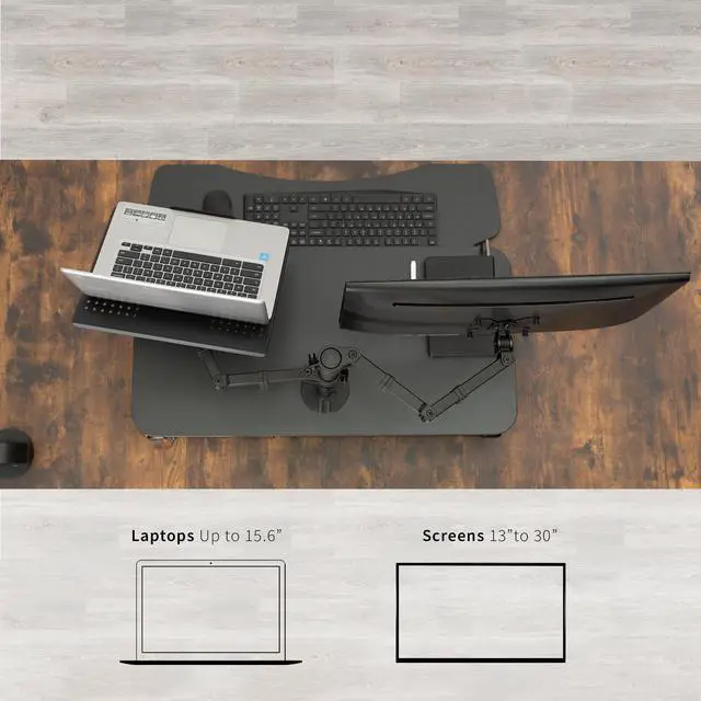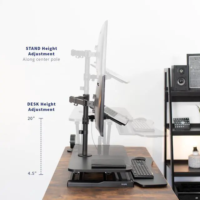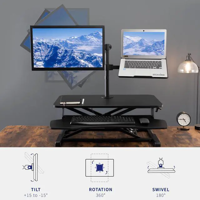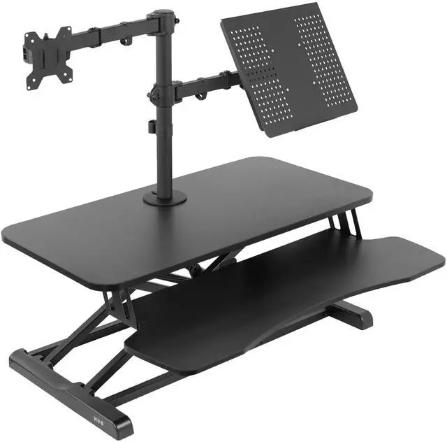 Create your own active workstation with the Black Desk Riser with Monitor & Laptop Mount (DESK-KIT-V000K2C) from VIVO! Transitioning between sitting and standing throughout the long work day provides numerous health benefits for the body, including increased blood flow and reduced aches and pains. This solidly built desk riser allows you to make height transitions at the squeeze of a handle, and the monitor + laptop stand attaches to your riser via sturdy grommet mount for additional height adjustment options and comfortable viewing angles. All hardware and instructions are provided so you can get your new desk riser and monitor stand assembled in no time!