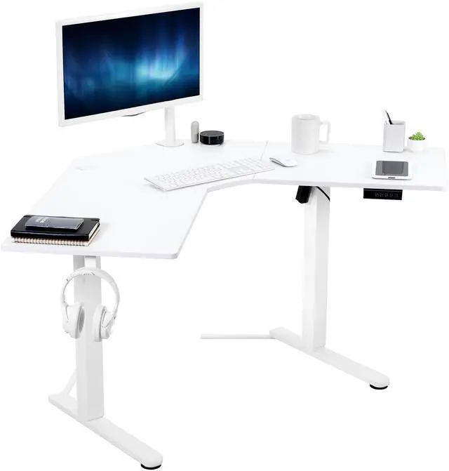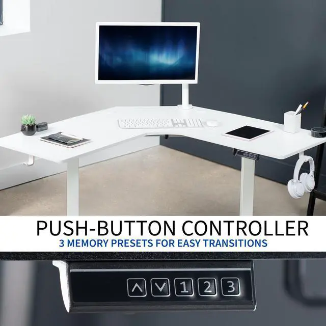 Enjoy a spacious workstation that accommodates an active work life with the White Corner Electric Desk (DESK-E1L94W) from VIVO! Periodically standing throughout the long work day helps relieve tension on the neck, back, and shoulders while increasing blood flow and reducing stress. Enjoy being able to stand up in seconds with this corner workstation featuring a powerful motor lift system for smooth height transitions, a simple push button controller with 3 memory presets, and solid legs supporting up to 154 lbs. The cable management system ensures that cords and cables are neatly organized for a tidy workspace that encourages concentration. All hardware and instructions are provided for assembly, so you can experience your own active desk in no time!