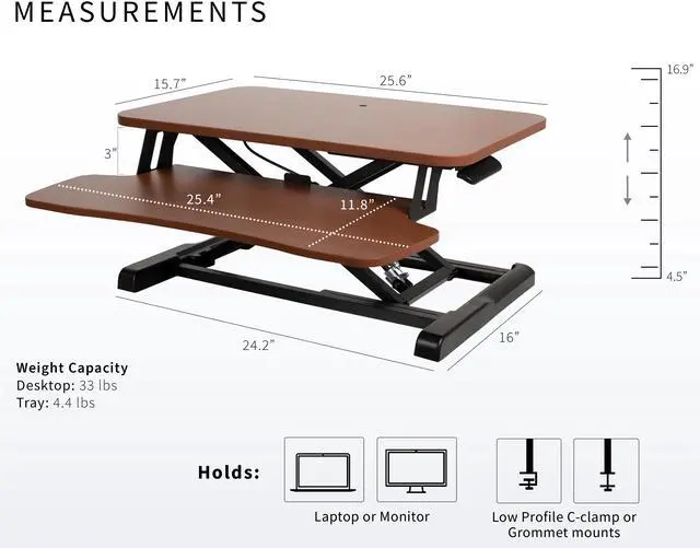 Enhance your work experience with the Dark Walnut / Black 26" Compact Desk Riser (DESK-V026KA) from VIVO! Transitioning between sitting and standing throughout the long work day provides numerous health benefits for the body such as increased blood flow and reduced aches and pains. This solidly built desktop supports up to 33 lbs, easily holding your monitor or laptop with ease. It also features pneumatic spring lift that allows simple and smooth height adjustment (4.5 to 16.9) at the squeeze of a handle. The dual-tiered design allows you to customize your work area to create the workflow you need, and the keyboard tray is removable using the provided hex tool. All hardware and instructions are provided so you can get your new desk riser assembled and workspace organized in no time!