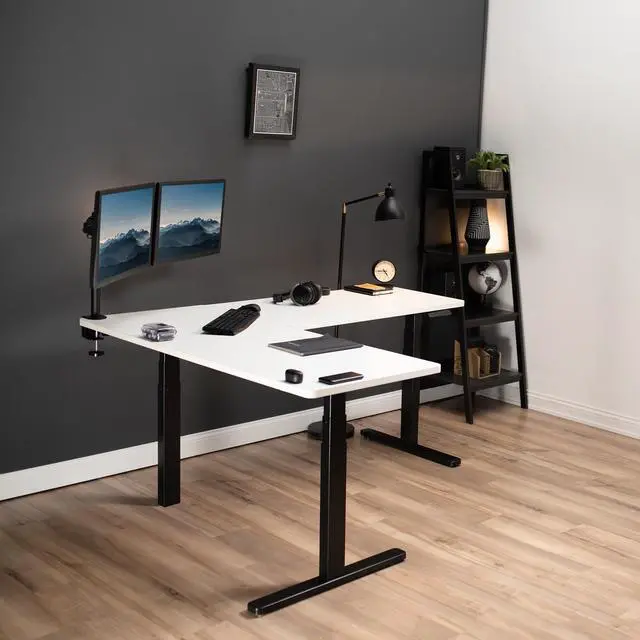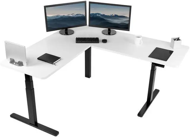 Enjoy a spacious workstation that accommodates an active work life with the White / Black Corner 67 x 60 Electric Desk (DESK-KIT-3E6BW) from VIVO! Periodically standing throughout the long work day can help relieve tension on the neck, back, and shoulders, as well as increase blood flow and reduce stress. Enjoy being able to stand up in seconds with this sturdy l-shaped desk featuring a multi-motor lift system for smooth height transition, a control panel for customizable settings, and solid legs supporting up to 300 lbs. The cable management system ensures that cords and cables are neatly organized for a tidy workspace that encourages concentration. All hardware and instructions are included for assembly. Dont wait to experience your own spacious work area that helps you stay organized and think on your feet!