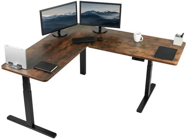 Enjoy a spacious workstation that accommodates an active work life with the Vintage Brown / Black Corner 67 x 60 Electric Desk (DESK-KIT-3E6N) from VIVO! Periodically standing throughout the long work day can help relieve tension on the neck, back, and shoulders, as well as increase blood flow and reduce stress. Enjoy being able to stand up in seconds with this sturdy l-shaped desk featuring a multi-motor lift system for smooth height transition, a control panel for customizable settings, and solid legs supporting up to 300 lbs. The cable management system ensures that cords and cables are neatly organized for a tidy workspace that encourages concentration. All hardware and instructions are included for assembly. Dont wait to experience your own spacious work area that helps you stay organized and think on your feet!