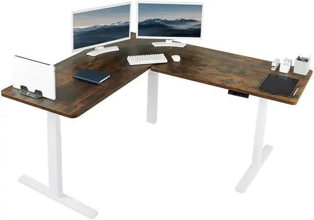 Enjoy a spacious workstation that accommodates an active work life with the Vintage Brown / White Corner 67" x 60" Electric Desk (DESK-KIT-3E6WN) from VIVO! Periodically standing throughout the long work day can help relieve tension on the neck, back, and shoulders, as well as increase blood flow and reduce stress. Enjoy being able to stand up in seconds with this sturdy l-shaped desk featuring a multi-motor lift system for smooth height transition, a control panel for customizable settings, and solid legs supporting up to 300 lbs. The cable management system ensures that cords and cables are neatly organized for a tidy workspace that encourages concentration. All hardware and instructions are included for assembly. Dont wait to experience your own spacious work area that helps you stay organized and think on your feet!