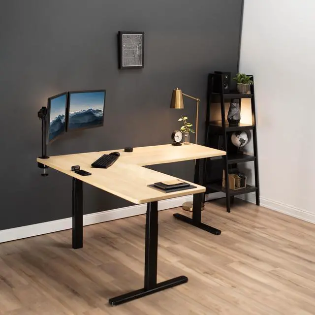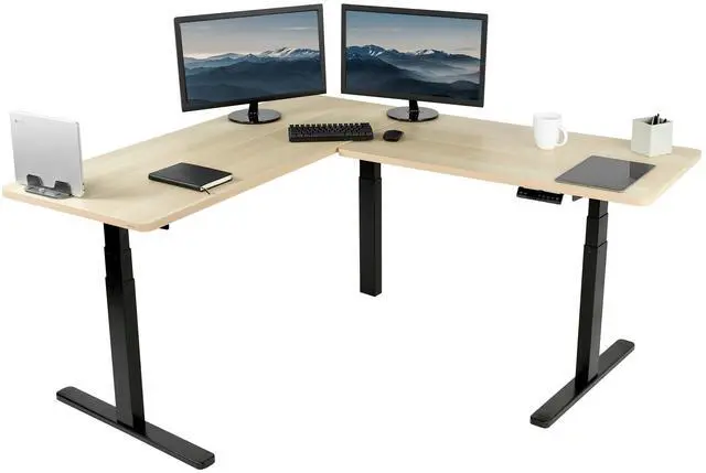 Enjoy a spacious workstation that accommodates an active work life with the Light Wood / Black Corner 67 x 60 Electric Desk (DESK-KIT-3E6BC) from VIVO! Periodically standing throughout the long work day can help relieve tension on the neck, back, and shoulders, as well as increase blood flow and reduce stress. Enjoy being able to stand up in seconds with this sturdy l-shaped desk featuring a multi-motor lift system for smooth height transition, a control panel for customizable settings, and solid legs supporting up to 300 lbs. The cable management system ensures that cords and cables are neatly organized for a tidy workspace that encourages concentration. All hardware and instructions are included for assembly. Dont wait to experience your own spacious work area that helps you stay organized and think on your feet!