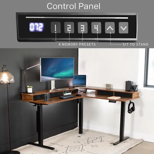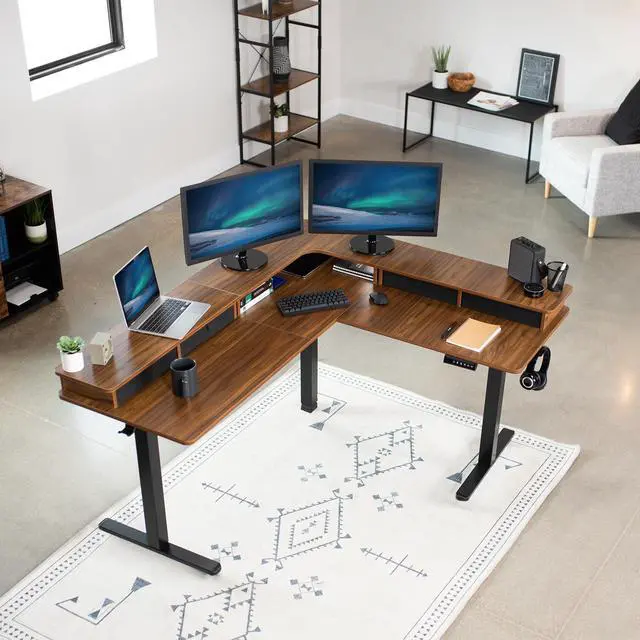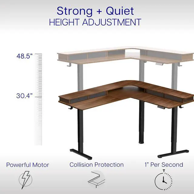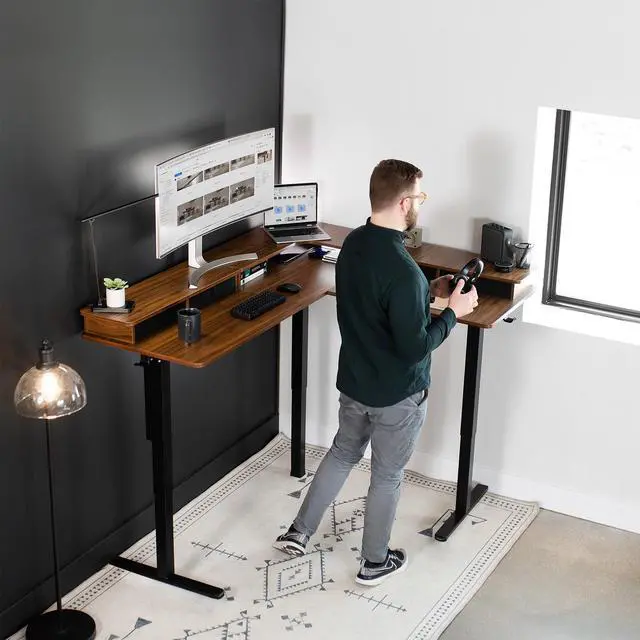 Enjoy an active work life with the Dark Walnut / Black 2 Tier 63" x 55" Corner Electric Desk with Storage (DESK-E3CVD) from VIVO! The innovative 2-tier design will change the way you work, with a spacious layout and convenient storage. Set the main desktop at your preferred typing height, and place your monitors on the top surface for ergonomic screen viewing. Finding a healthy balance between sitting and standing throughout the long work day is made possible with an electric motor, telescopic legs, and a simple push-button memory controller. Durable casters provide smooth mobility on a variety of floor types and are lockable when you want your corner desk to be stationary. All hardware and instructions are provided, so you can get your new active workstation assembled and taking you to new heights!