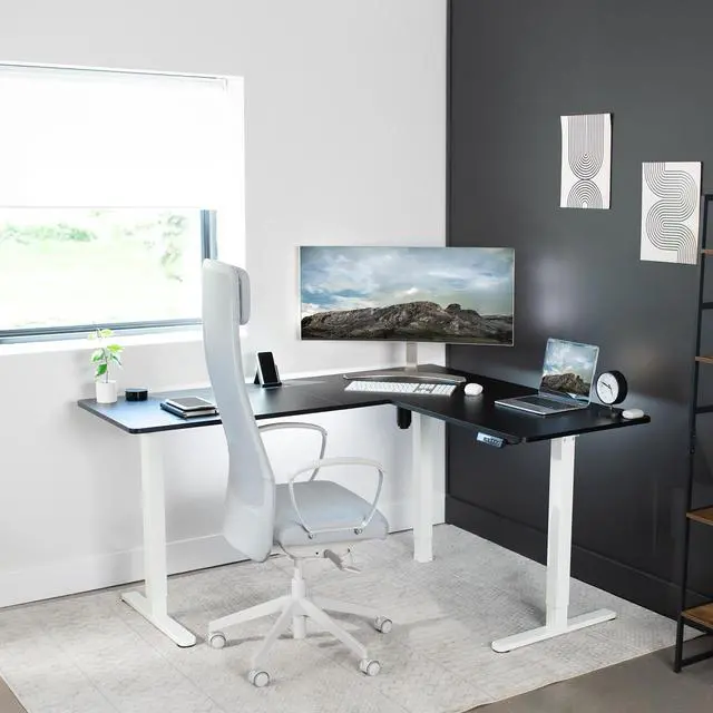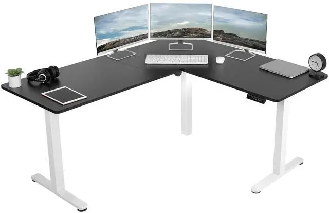 Enjoy a spacious workstation that accommodates an active work life with the Black / White 63" x 55" Corner Electric Desk (DESK-E3CTWB) from VIVO! Periodically standing throughout the long work day can help relieve tension on the neck, back, and shoulders, as well as increase blood flow and reduce stress. Enjoy being able to stand up in seconds with this sturdy l-shaped desk featuring a single motor lift system for smooth height transitions, memory control panel for customizable settings, and solid legs supporting up to 176 lbs. All hardware and instructions are provided for assembly, so you can experience your own spacious work area that helps you stay organized and think on your feet!