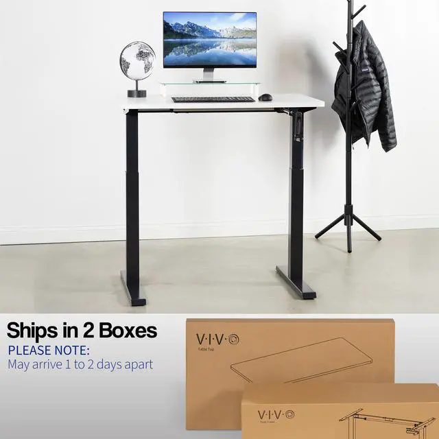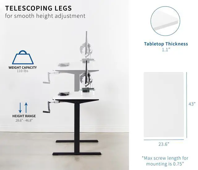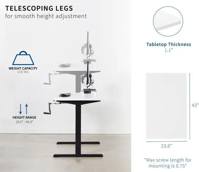 Transform your workstation to accommodate an active work life with the White / Black 43 x 24 Manual Height Adjustable Desk (DESK-KIT-MB4W) from VIVO! Finding a healthy balance between sitting and standing throughout the long work day is made possible with manual height adjustment, telescopic legs, and an easy-to-use hand crank. The sturdy table top provides room for dual-monitor setups and important supplies so you can organize your workspace to fit your preferred layout. With a frame constructed of solid steel, this desk easily supports up to 110 lbs and is built to last. All necessary hardware and instructions are provided, so you can get your new workstation assembled and taking your processes to new heights!