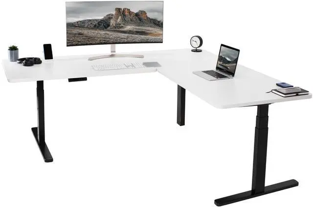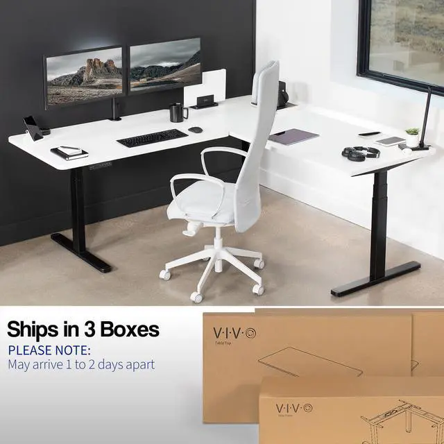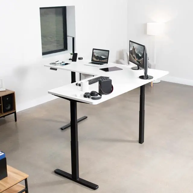 Enjoy a spacious workstation that accommodates an active work life with the White / Black Corner 77" x 71" Electric Desk (DESK-KIT-3E7BW) from VIVO! Periodically standing throughout the long work day can help relieve tension on the neck, back, and shoulders, as well as increase blood flow and reduce stress. Enjoy being able to stand up in seconds with this sturdy l-shaped desk featuring a multi-motor lift system for smooth height transition, a memory control panel for saved height settings, and solid legs supporting up to 300 lbs. All hardware and instructions are included for assembly. Dont wait to experience your own spacious work area that helps you stay organized and think on your feet!