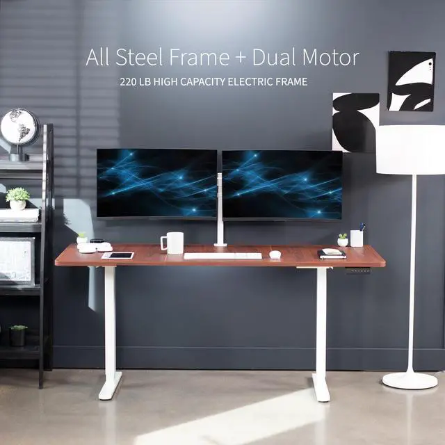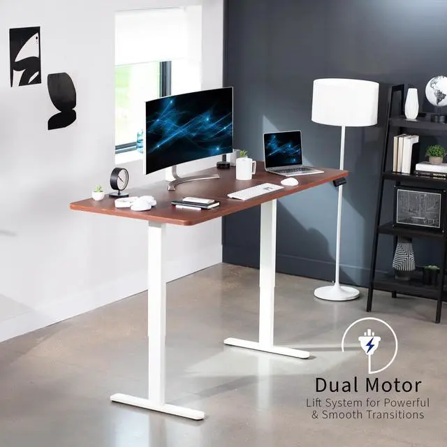 Transform your workstation to accommodate an active work life with the Dark Walnut / White 71" x 30" Dual Motor Electric Desk (DESK-KIT-E2W7D) from VIVO! Finding a healthy balance between sitting and standing throughout the long work day is made possible with electric height adjustment, telescopic legs, and a push-button control panel featuring 3 memory presets. The spacious, extra-deep table top provides room for multi-monitor setups and important supplies so you can organize your workspace to fit your preferred layout. With a frame constructed of solid steel, this desk supports up to 220 lbs and is built to last. All hardware and instructions are provided, so you can get your new workstation assembled and taking you to new heights!