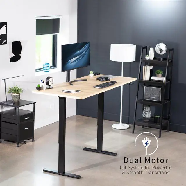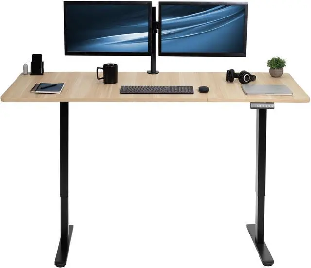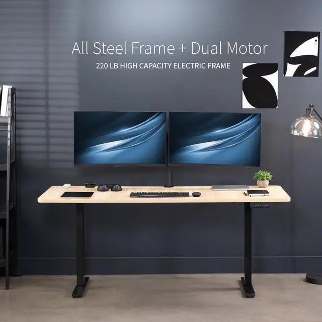 Transform your workstation to accommodate an active work life with the Light Wood / Black 71" x 30" Dual Motor Electric Desk (DESK-KIT-E2B7C) from VIVO! Finding a healthy balance between sitting and standing throughout the long work day is made possible with electric height adjustment, telescopic legs, and a push-button control panel featuring 3 memory presets. The spacious, extra-deep table top provides room for multi-monitor setups and important supplies so you can organize your workspace to fit your preferred layout. With a frame constructed of solid steel, this desk supports up to 220 lbs and is built to last. All hardware and instructions are provided, so you can get your new workstation assembled and taking you to new heights!