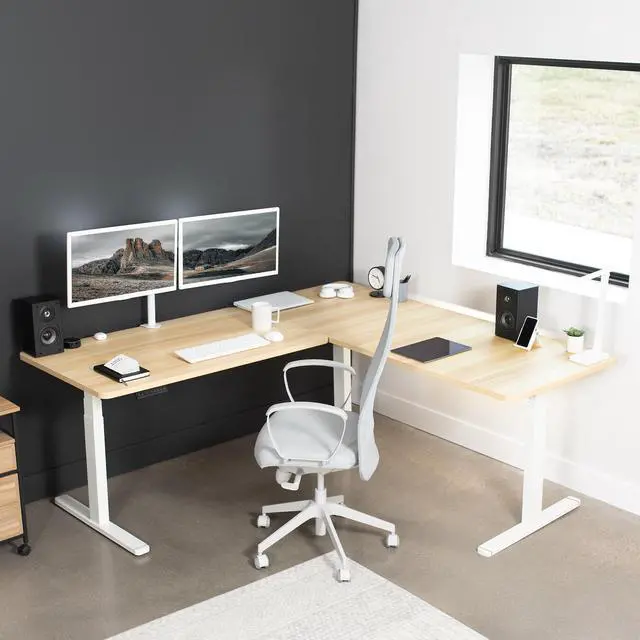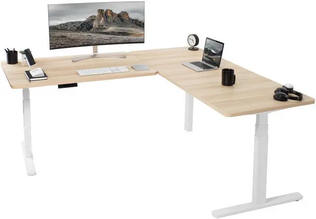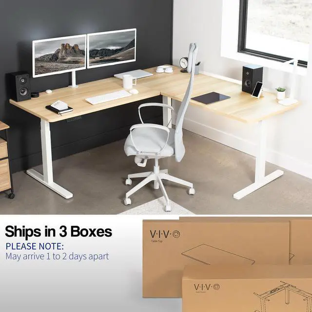 Enjoy a spacious workstation that accommodates an active work life with the Light Wood / White Corner 77" x 71" Electric Desk (DESK-KIT-3E7WC) from VIVO! Periodically standing throughout the long work day can help relieve tension on the neck, back, and shoulders, as well as increase blood flow and reduce stress. Enjoy being able to stand up in seconds with this sturdy l-shaped desk featuring a multi-motor lift system for smooth height transition, a memory control panel for saved height settings, and solid legs supporting up to 300 lbs. All hardware and instructions are included for assembly. Dont wait to experience your own spacious work area that helps you stay organized and think on your feet!