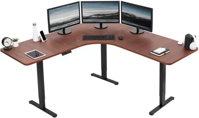 Enjoy a spacious workstation that accommodates an active work life with the Dark Walnut / Black 71" x 71" Curved Corner Electric Desk (DESK-KIT-E3CBD) from VIVO! Periodically standing throughout the long work day can help relieve tension on the neck, back, and shoulders, as well as increase blood flow and reduce stress. Enjoy being able to stand up in seconds with this sturdy l-shaped desk featuring a multi-motor lift system for smooth height transition, a control panel with 4 memory settings, and solid legs supporting up to 264 lbs. All hardware and instructions are provided for assembly. Dont wait to experience your own spacious work area that helps you stay organized and think on your feet!
