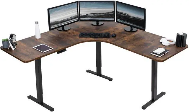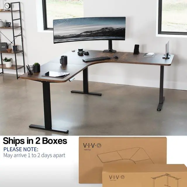 Enjoy a spacious workstation that accommodates an active work life with the Vintage Brown / Black 71" x 71" Curved Corner Electric Desk (DESK-KIT-E3CBN) from VIVO! Periodically standing throughout the long work day can help relieve tension on the neck, back, and shoulders, as well as increase blood flow and reduce stress. Enjoy being able to stand up in seconds with this sturdy l-shaped desk featuring a multi-motor lift system for smooth height transition, a control panel with 4 memory settings, and solid legs supporting up to 264 lbs. All hardware and instructions are provided for assembly. Dont wait to experience your own spacious work area that helps you stay organized and think on your feet!