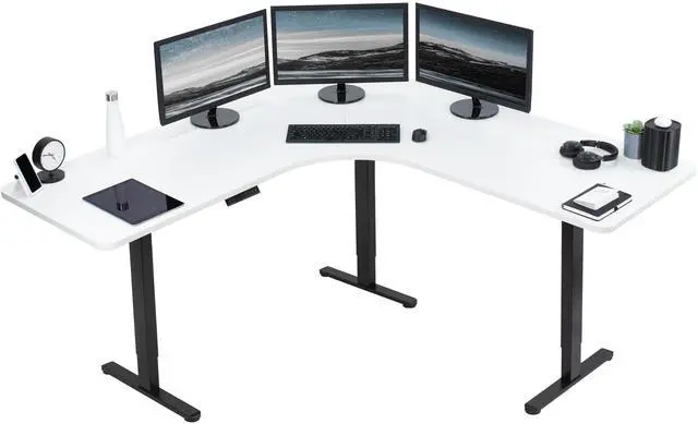 Enjoy a spacious workstation that accommodates an active work life with the White / Black 71" x 71" Curved Corner Electric Desk (DESK-KIT-E3CBW) from VIVO! Periodically standing throughout the long work day can help relieve tension on the neck, back, and shoulders, as well as increase blood flow and reduce stress. Enjoy being able to stand up in seconds with this sturdy l-shaped desk featuring a multi-motor lift system for smooth height transition, a control panel with 4 memory settings, and solid legs supporting up to 264 lbs. All hardware and instructions are provided for assembly. Dont wait to experience your own spacious work area that helps you stay organized and think on your feet!