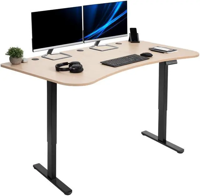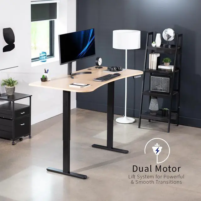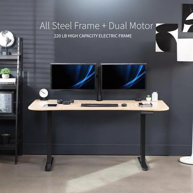 Transform your workstation to accommodate an active work life with the Light Wood / Black 63" x 32" Dual Motor Electric Desk (DESK-KIT-E2B1C) from VIVO! Find that healthy balance between sitting and standing throughout the long work day with electric height adjustment, telescopic legs, and a simple push-button controller featuring 3 memory presets. With a frame constructed of solid steel, this desk supports up to 220 lbs and is built to last. The table top comes packaged in 3 sections, and all hardware is provided to get your desk frame put together and installed to your desktop in no time! Please Note: This product ships in 2 separate boxes that may not arrive at the same time, and each package contains a helpful instruction guide.