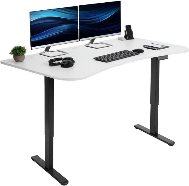 Transform your workstation to accommodate an active work life with the White / Black 63" x 32" Dual Motor Electric Desk (DESK-KIT-E2B1W) from VIVO! Find that healthy balance between sitting and standing throughout the long work day with electric height adjustment, telescopic legs, and a simple push-button controller featuring 3 memory presets. With a frame constructed of solid steel, this desk supports up to 220 lbs and is built to last. The table top comes packaged in 3 sections, and all hardware is provided to get your desk frame put together and installed to your desktop in no time! Please Note: This product ships in 2 separate boxes that may not arrive at the same time, and each package contains a helpful instruction guide.