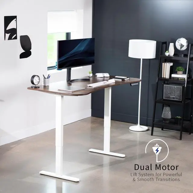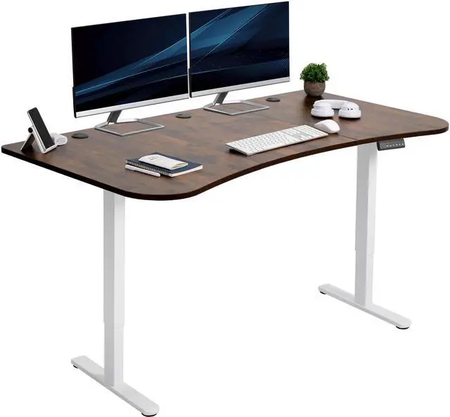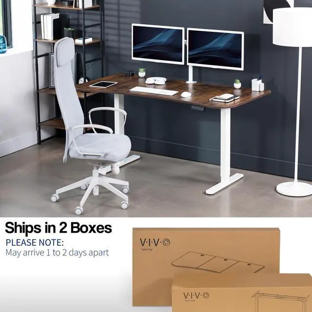 Transform your workstation to accommodate an active work life with the Vintage Brown / White 63" x 32" Dual Motor Electric Desk (DESK-KIT-E2W1N) from VIVO! Find that healthy balance between sitting and standing throughout the long work day with electric height adjustment, telescopic legs, and a simple push-button controller featuring 3 memory presets. With a frame constructed of solid steel, this desk supports up to 220 lbs and is built to last. The table top comes packaged in 3 sections, and all hardware is provided to get your desk frame put together and installed to your desktop in no time! Please Note: This product ships in 2 separate boxes that may not arrive at the same time, and each package contains a helpful instruction guide.