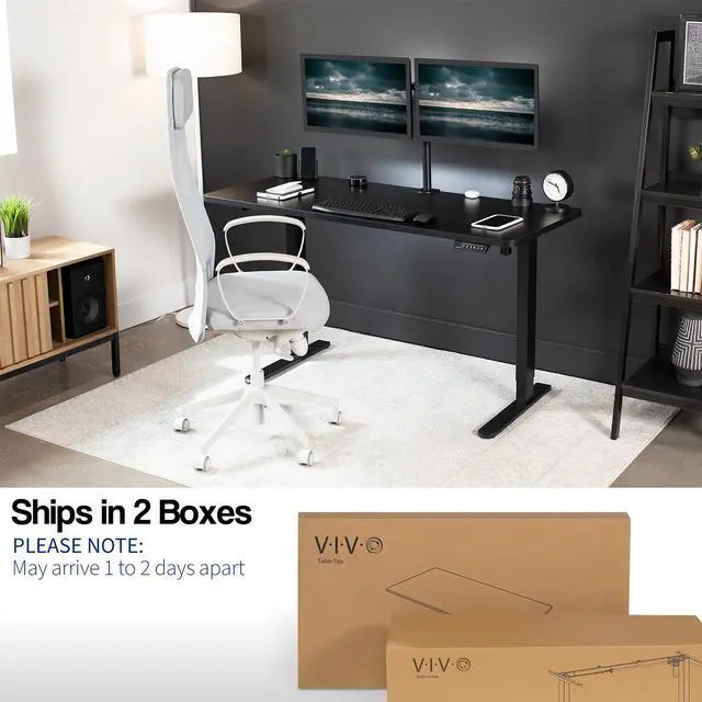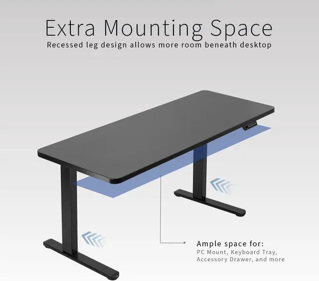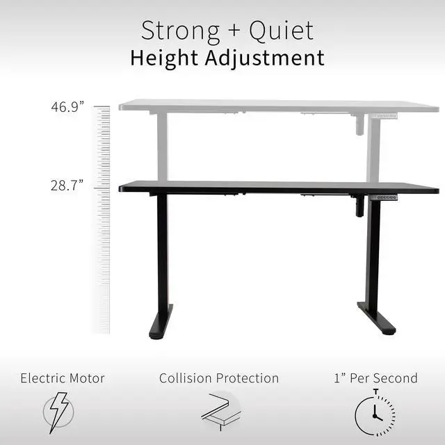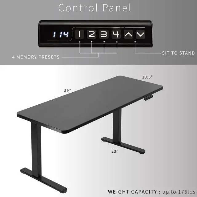 Transform your workstation to accommodate an active work life with the Black 60" x 24" Electric Desk with Rear-set Legs (DESK-KIT-E1RB6B) from VIVO! Finding a healthy balance between sitting and standing throughout the long work day is made possible with electric height adjustment, telescopic legs, and a simple push-button controller featuring 4 memory presets. The spacious table top provides room for dual monitor setups and important supplies so you can organize your workspace to fit your desired layout. With a frame constructed of solid steel, this desk supports up to 176 lbs and is built to last. Rear-set legs create an open front design that gives you more legroom and storage space in front of the columns. All hardware and instructions are provided, so you can get your new workstation assembled and experience your very own standing desk in no time!