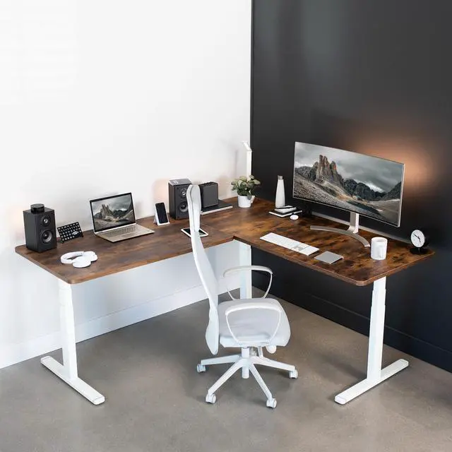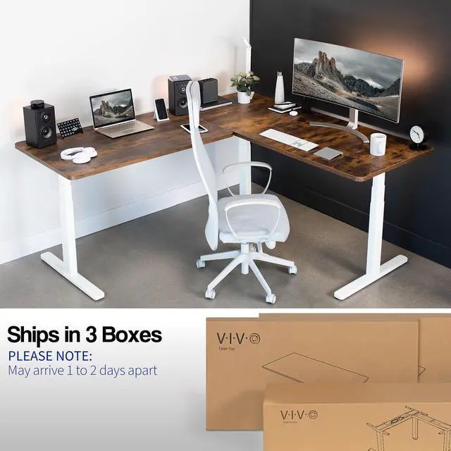 Enjoy a spacious workstation that accommodates an active work life with the Vintage Brown / White Corner 77" x 71" Electric Desk (DESK-KIT-3E7WN) from VIVO! Periodically standing throughout the long work day can help relieve tension on the neck, back, and shoulders, as well as increase blood flow and reduce stress. Enjoy being able to stand up in seconds with this sturdy l-shaped desk featuring a multi-motor lift system for smooth height transition, a memory control panel for saved height settings, and solid legs supporting up to 300 lbs. All hardware and instructions are included for assembly. Dont wait to experience your own spacious work area that helps you stay organized and think on your feet!