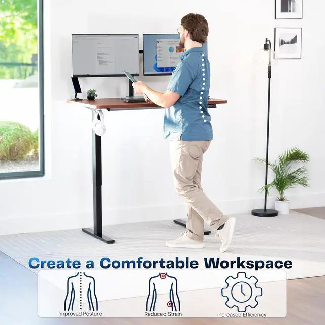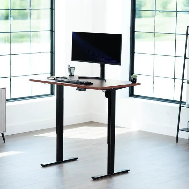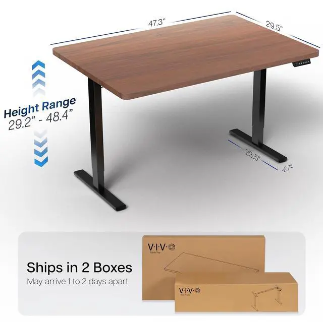 Transform your workstation to accommodate an active work life with the Dark Walnut / Black 48" x 30" Electric Desk (DESK-KIT-1B5D) from VIVO! Finding a healthy balance between sitting and standing throughout the long work day is made possible with electric height adjustment, telescopic legs, and a simple push-button controller featuring 4 memory presets. The extra deep table top provides room for dual-monitor setups and important supplies so you can organize your workspace to fit your desired layout. With a frame constructed of solid steel, this desk supports up to 220 lbs and is built to last. All hardware and instructions are provided, so you can get your new workstation assembled and experience your very own standing desk in no time!
