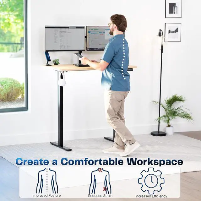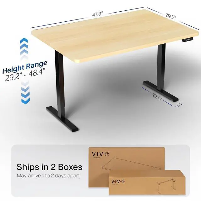 Transform your workstation to accommodate an active work life with the Light Wood / Black 48" x 30" Electric Desk (DESK-KIT-1B5C) from VIVO! Finding a healthy balance between sitting and standing throughout the long work day is made possible with electric height adjustment, telescopic legs, and a simple push-button controller featuring 4 memory presets. The extra deep table top provides room for dual-monitor setups and important supplies so you can organize your workspace to fit your desired layout. With a frame constructed of solid steel, this desk supports up to 220 lbs and is built to last. All hardware and instructions are provided, so you can get your new workstation assembled and experience your very own standing desk in no time!