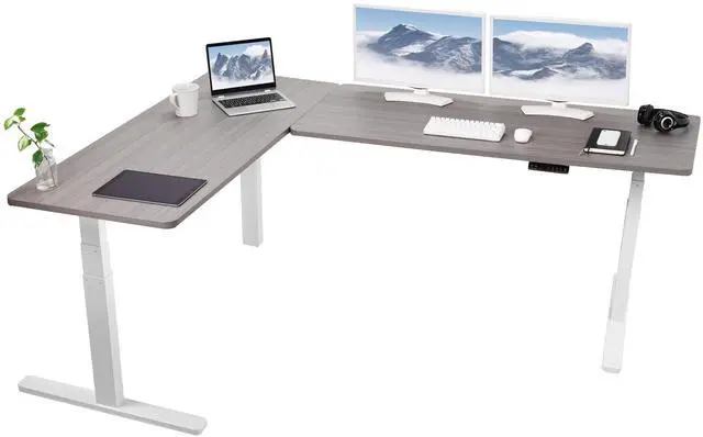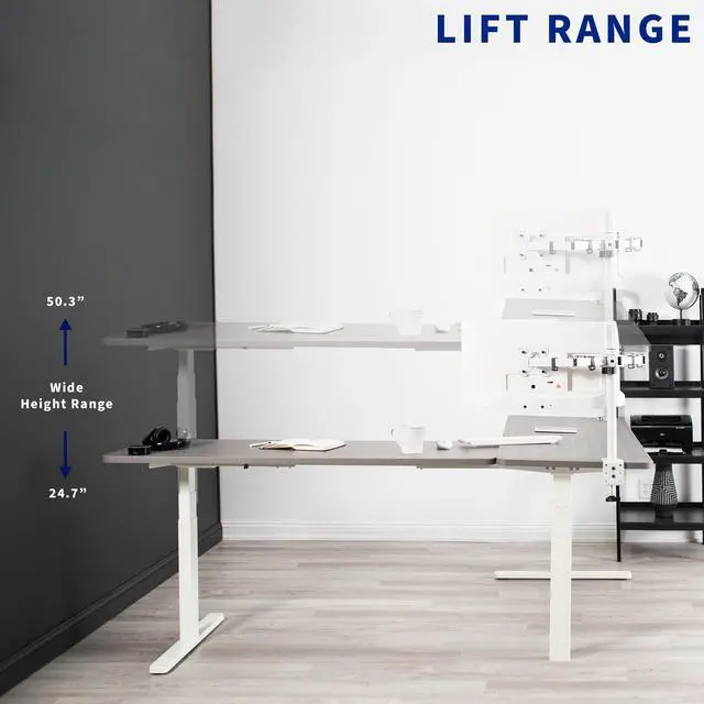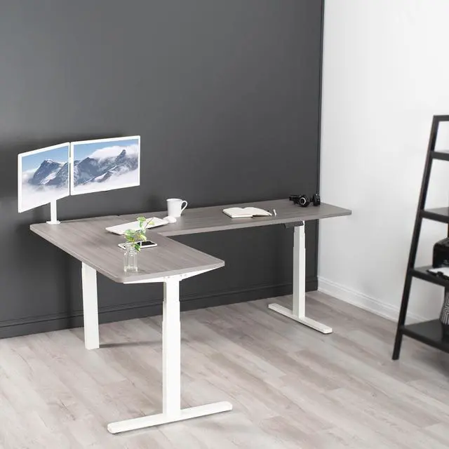 Enjoy a spacious workstation that accommodates an active work life with the Dark Gray / White Corner 83" x 60" Electric Desk (DESK-KIT-3E8WG) from VIVO! Periodically standing throughout the long work day can help relieve tension on the neck, back, and shoulders, as well as increase blood flow and reduce stress. Enjoy being able to stand up in seconds with this sturdy l-shaped desk featuring a multi-motor lift system for smooth height transition, a control panel for customizable settings, and solid legs supporting up to 300 lbs. The cable management system ensures that cords and cables are neatly organized for a tidy workspace that encourages concentration. All hardware and instructions are included for assembly. Dont wait to experience your own spacious work area that helps you stay organized and think on your feet!
