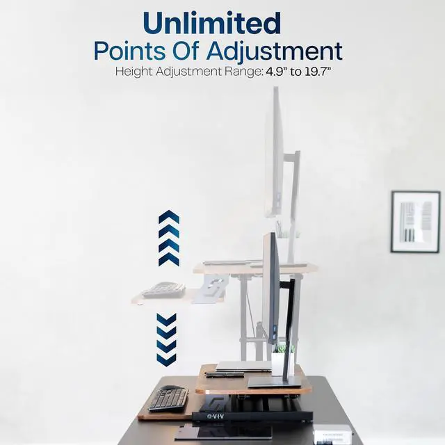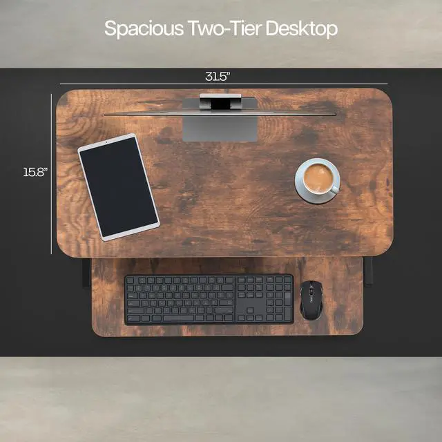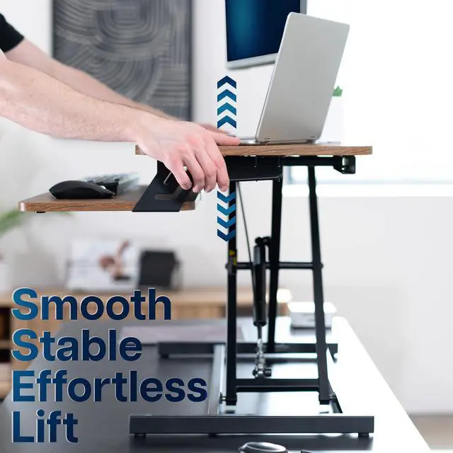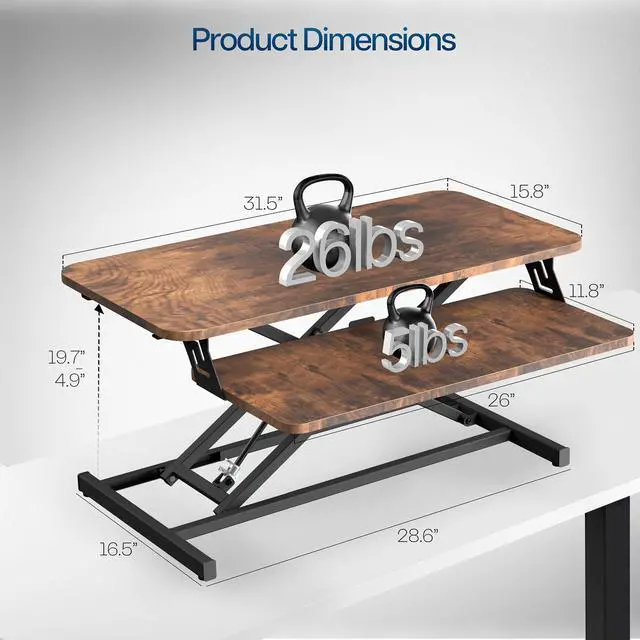 Enhance your work experience with a Vintage Brown 32 Desk Riser (DESK-V000SN) from VIVO! Transitioning between sitting and standing throughout the long work day provides numerous benefits for the body such as increased blood flow and reduced tension. This solidly built desktop supports up to 26 lbs, easily holding multiple monitors or laptop and monitor combinations. It also features pneumatic spring lift that allows simple and smooth height adjustment at the squeeze of a handle. The dual-tiered design allows you to customize your work area to create the workflow you need, and the keyboard tray is removable using the provided hex tool. All hardware and instructions are provided so you can get your new desk riser assembled and workspace organized in no time!
